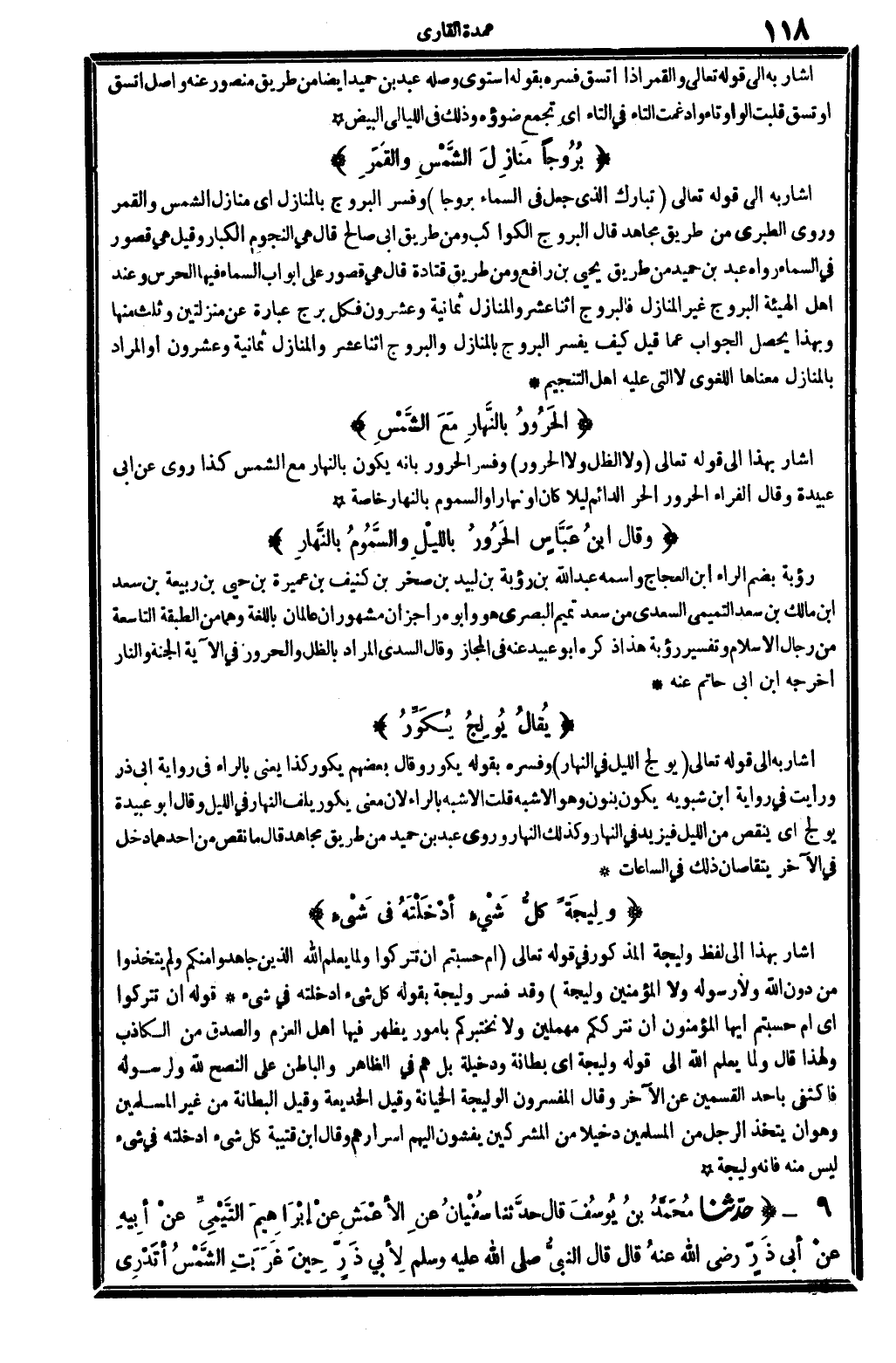 أَشَارَ بِهِ إلَى قولِهِ تعَالَى: {تبَارك الَّذِي جعل فِي السَّمَاء بروجاً} (الْفرْقَان: 16) . وَفسّر البروج بالمنازل أَي: منَازِل الشَّمْس وَالْقَمَر. وروى الطَّبَرِيّ من طَرِيق مُجَاهِد، قَالَ: البروج الْكَوَاكِب، وَمن طَرِيق أبي صَالح قَالَ: هِيَ النُّجُوم الْكِبَار، وَقيل: هِيَ قُصُور فِي السَّمَاء، رَوَاهُ عبد بن حميد من طَرِيق يحيى بن رَافع، وَمن طَرِيق قَتَادَة قَالَ: هِيَ قُصُور على أَبْوَاب السَّمَاء فِيهَا الحرس، وَعند أهل الْهَيْئَة: البروج غير الْمنَازل، فالبروج اثْنَا عشر، والمنازل ثَمَانِيَة وَعِشْرُونَ، فَكل برج عبارَة عَن منزلتين، وَثلث مِنْهَا، وَبِهَذَا يحصل الْجَواب عَمَّا قيل: كَيفَ يُفَسر البروج بالمنازل والبروج اثْنَا عشر والمنازل ثَمَانِيَة وَعِشْرُونَ؟ أَو المُرَاد بالمنازل مَعْنَاهَا اللّغَوِيّ لَا الَّتِي عَلَيْهِ أهل التنجيم.