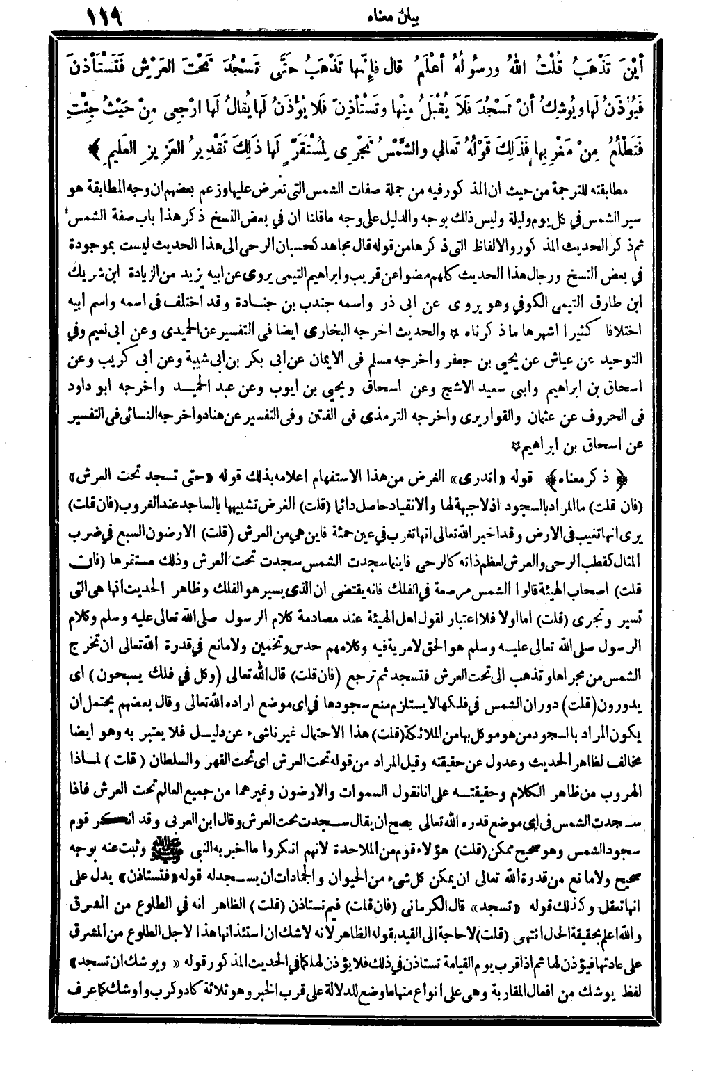 أيْنَ تَذْهَبُ قُلْتُ الله ورسُولُهُ أعْلَمُ قَالَ فإنَّهَا تَذْهَبُ حَتَّى تَسْجُدَ تَحْتَ العَرْشِ فَتَسْتَأذِنَ فَيُؤذَنُ لَهَا ويُوشِكُ أنْ تَسْجُدَ فَلاَ يُقْبَلُ مِنْهَا وتَسْتَأذِنَ فَلاَ يُؤذَنُ لَهَا يُقالُ لَها ارْجِعِي مِنْ حَيْثُ جِئْتِ فتَطْلُعُ مِنْ مَغْرِبِهَ فَذَلِكَ قَوْلُهُ تَعالى: {والشَّمُسُ تَجْرِي لِمُسْتَقَرٍّ لَهَا ذَلِكَ تَقْدِيرُ العَزِيزِ العَلِيمِ} (ي س: 83) .