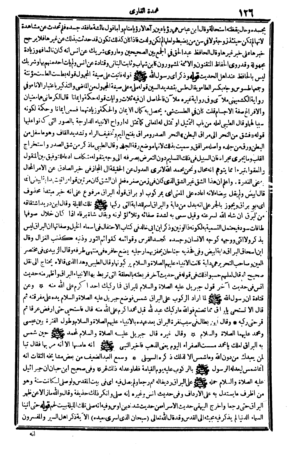 بجسده وَحَال يقظته اسْتِحَالَة، وَقَالَ ابْن عَبَّاس: هِيَ رُؤْيا عين رَآهَا لَا رُؤْيا مَنَام. وَأما قَول عَائِشَة: مَا فقد جسده، فَلم يحدث عَن مُشَاهدَة لِأَنَّهَا لم تكن حِينَئِذٍ زَوْجَة وَلَا فِي سنّ من يضْبط، ولعلها لم تكن ولدت، فَإِذا كَانَ كَذَلِك تكون قد حدثت بذلك عَن غَيرهَا، فَلَا يرجح خَبَرهَا على خبر غَيرهَا، وَقَالَ الْحَافِظ عبد الْحق فِي (الْجمع بَين الصَّحِيحَيْنِ) : وَمَا روى شريك عَن أنس أَنه كَانَ نَائِما، فَهُوَ زِيَادَة مَجْهُولَة، وَقد روى الْحفاظ المتقنون وَالْأَئِمَّة المشهورون كَابْن شهَاب وثابت الْبنانِيّ وَقَتَادَة عَن أنس، وَلم يَأْتِ أحد مِنْهُم بهَا، وَشريك لَيْسَ بِالْحَافِظِ عِنْد أهل الحَدِيث. قَوْله: (وَذكر) أَي: رَسُول الله، صلى الله عَلَيْهِ وَسلم. قَوْله: (فأتايت) على صِيغَة الْمَجْهُول، قَوْله: (بطست) الطست مُؤَنّثَة وَجَمعهَا طسوس وَجَاء بِكَسْر الطَّاء، وَيُقَال: طس بتَشْديد السِّين. قَوْله: (ملىء) على صِيغَة الْمَجْهُول من الْمَاضِي والتذكير بِاعْتِبَار الْإِنَاء، وَفِي رِوَايَة الْكشميهني: ملآى، وَفِي رِوَايَة غَيره: ملآن، فَالْحَاصِل أَن فِيهِ ثَلَاث رِوَايَات. قَوْله: (حِكْمَة وإيماناً) قَالَ الْكرْمَانِي: هما مَعْنيانِ، والإفراغ صفة الْأَجْسَام. قلت: كَانَ فِي الطست شَيْء يحصل بِهِ كَمَال الْإِيمَان وَالْحكمَة وزيادتهما، فَسُمي إِيمَانًا وَحِكْمَة، لكَونه سَببا لَهما. وَقَالَ الطَّيِّبِيّ: لعبه من بَاب التَّمْثِيل أَو تمثل لَهُ الْمعَانِي كَمَا تمثل لَهُ أَرْوَاح الْأَنْبِيَاء الدارجة بالصور الَّتِي كَانُوا عَلَيْهَا. قَوْله: (فشق من النَّحْر إِلَى مراق الْبَطن) النَّحْر الصَّدْر ومراق، بِفَتْح الْمِيم وَتَخْفِيف الرَّاء وَتَشْديد الْقَاف: وَهُوَ مَا سفل من الْبَطن ورق من جلده، وَأَصله مراقق، وَسميت بذلك لِأَنَّهَا مَوضِع رقة الْجلد، وَقَالَ الطَّيِّبِيّ: مَا ذكر من شقّ الصَّدْر واستخراج الْقلب وَمَا يجْرِي مجْرَاه، فَإِن السَّبِيل فِي ذَلِك التَّسْلِيم دون التَّعَرُّض بصرفه إِلَى وَجه يتقوله متكلف ادِّعَاء للتوفيق بَين الْمَنْقُول والمعقول تبروءاً مِمَّا يتَوَهَّم أَنه محَال، وَنحن بِحَمْد الله لَا نرى الْعُدُول عَن الْحَقِيقَة إِلَى الْمجَاز فِي خبر الصَّادِق عَن الْأَمر الْمحَال بِهِ على الْقُدْرَة. وَاعْلَم أَن هَذَا الشق غير الشق الَّذِي كَانَ فِي زمن صغره، فَعلم أَن الشق كَانَ مرَّتَيْنِ. قَوْله: (وأتيت بِدَابَّة أَبيض) إنماقال: أَبيض، وَلم يقل: بَيْضَاء، لِأَنَّهُ أَعَادَهُ على الْمَعْنى أَي: بمركوب أَو براق. قَوْله: (الْبراق) مَرْفُوع على أَنه خبر مُبْتَدأ مَحْذُوف، أَي: هُوَ براق، وَيجوز بِالْجَرِّ على أَنه بدل من دَابَّة، والبراق اسْم للدابة الَّتِي ركبهَا صلى الله عَلَيْهِ وَسلم تِلْكَ اللَّيْلَة. وَقَالَ ابْن دُرَيْد: اشتقاقه من الْبَرْق، إِن شَاءَ الله، لسرعته. وَقيل: سمي بِهِ لشدَّة صفائه وتلألؤ لَونه، وَيُقَال: شَاة برقاء إِذا كَانَ خلال صوفها طاقات سود، فَيحْتَمل التَّسْمِيَة بِهِ لكَونه ذَا لونين، وَذكر ابْن أبي خَالِد فِي كتاب (الاحتفال فِي أَسمَاء الْخَيل وصفاتها) : أَن الْبراق لَيْسَ بِذكر وَلَا أُنْثَى، وَوَجهه كوجه الْإِنْسَان وَجَسَده كجسد الْفرس، وقوائمه كقوائم الثور، وذنبه كذنب الغزال، وَقَالَ ابْن إِسْحَاق: الْبراق دَابَّة أَبيض وَفِي فَخذيهِ جَنَاحَانِ يحفز بهما رجلَيْهِ، يضع حَافره فِي مُنْتَهى طرفه، وَقَالَ الزبيدِيّ فِي (مُخْتَصر الْعين) وَصَاحب (التَّحْرِير) : هِيَ دَابَّة كَانَت الْأَنْبِيَاء، عَلَيْهِم الصَّلَاة وَالسَّلَام، يركبونها. وَقَالَ الطَّيِّبِيّ: وَهَذَا الَّذِي قَالَاه يحْتَاج إِلَى نقل صَحِيح، ثمَّ قَالَ: لَعَلَّهُم حسبوا ذَلِك فِي قَوْله فِي حَدِيث آخر: فربطته بالحلقة الَّتِي ترْبط بهَا الْأَنْبِيَاء الْبراق، وَأظْهر 