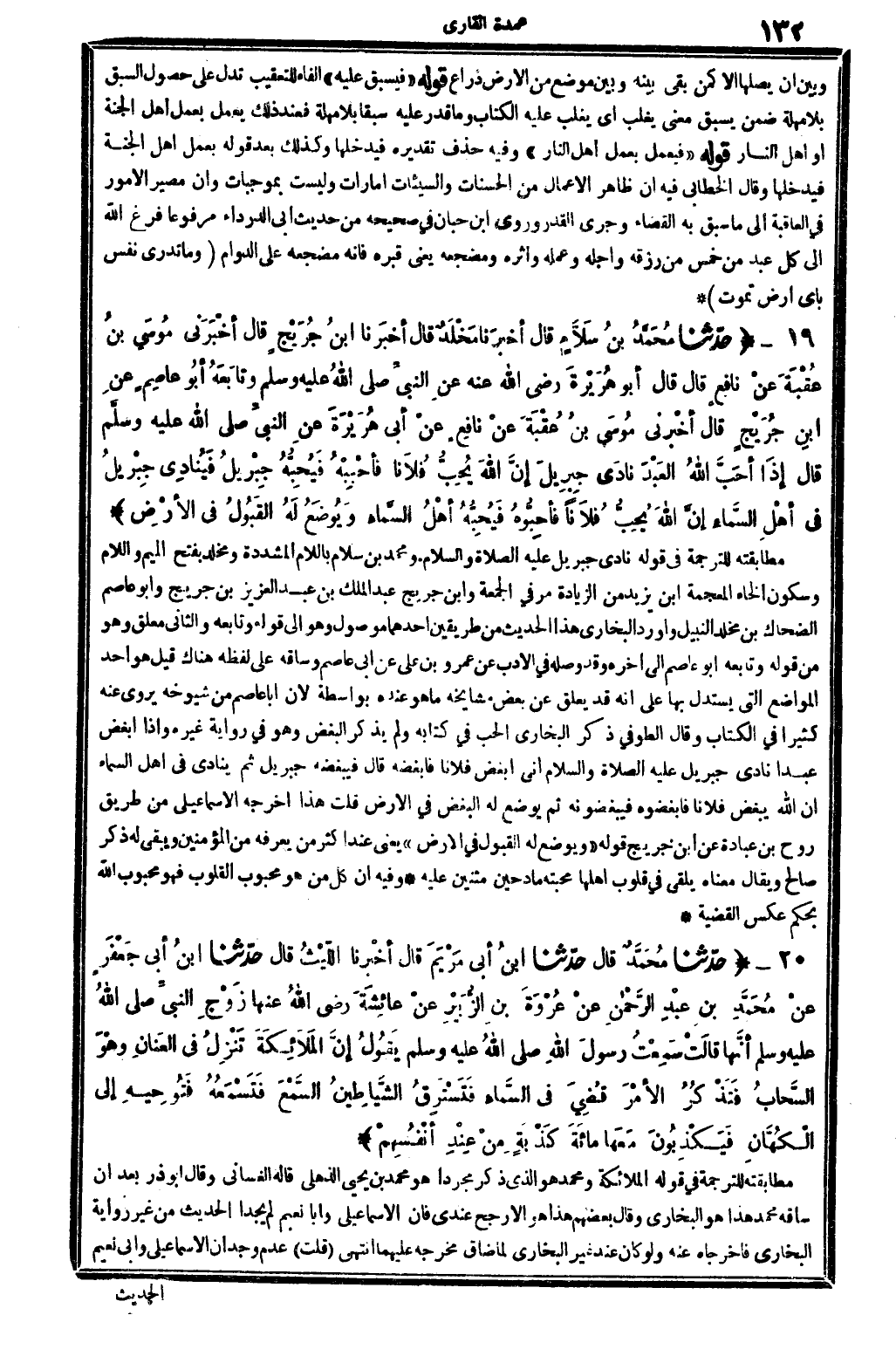 9023 - حدَّثنا مُحَمَّدُ بنُ سَلاَّمٍ قَالَ أخبرَنا مَخْلَدٌ قَالَ أخْبَرَنا ابنُ جُرَيْجٍ قَالَ أخْبَرَنِي مُوسَى بنُ عُقْبَةَ عنْ نافِعٍ قَالَ قَالَ أَبُو هُرَيْرَةَ رَضِي الله تَعَالَى عنهُ عنِ النَّبِيِّ صلى الله عَلَيْهِ وَسلم وتابَعَهُ أبُو عَاصِمٍ عنُ ابنِ جُرَيْجٍ قَالَ أخْبَرَنِي مُوسَى بنُ عُقْبَةَ عنْ نافِعٍ عنْ أبِي هُرَيْرَةَ عنِ النَّبِيِّ صلى الله عَلَيْهِ وَسلم قَالَ إذَا أحَبَّ الله العَبْدَ نادَى جِبْرِيلَ إنَّ الله يُحِبُّ فُلاناً فأحْبِبْهُ فيُحِبُّهُ جِبْرِيل فَيُنادِي جِبْرِيلُ فِي أهْلِ السَّماءِ إنَّ الله يُحِبُّ فُلاَناً فأحِبُّوهُ فَيُحِبُّهُ أهْلُ السَّمَاءِ ويُوضَعُ لَهُ القَبُولُ فِي الأرْضِ.