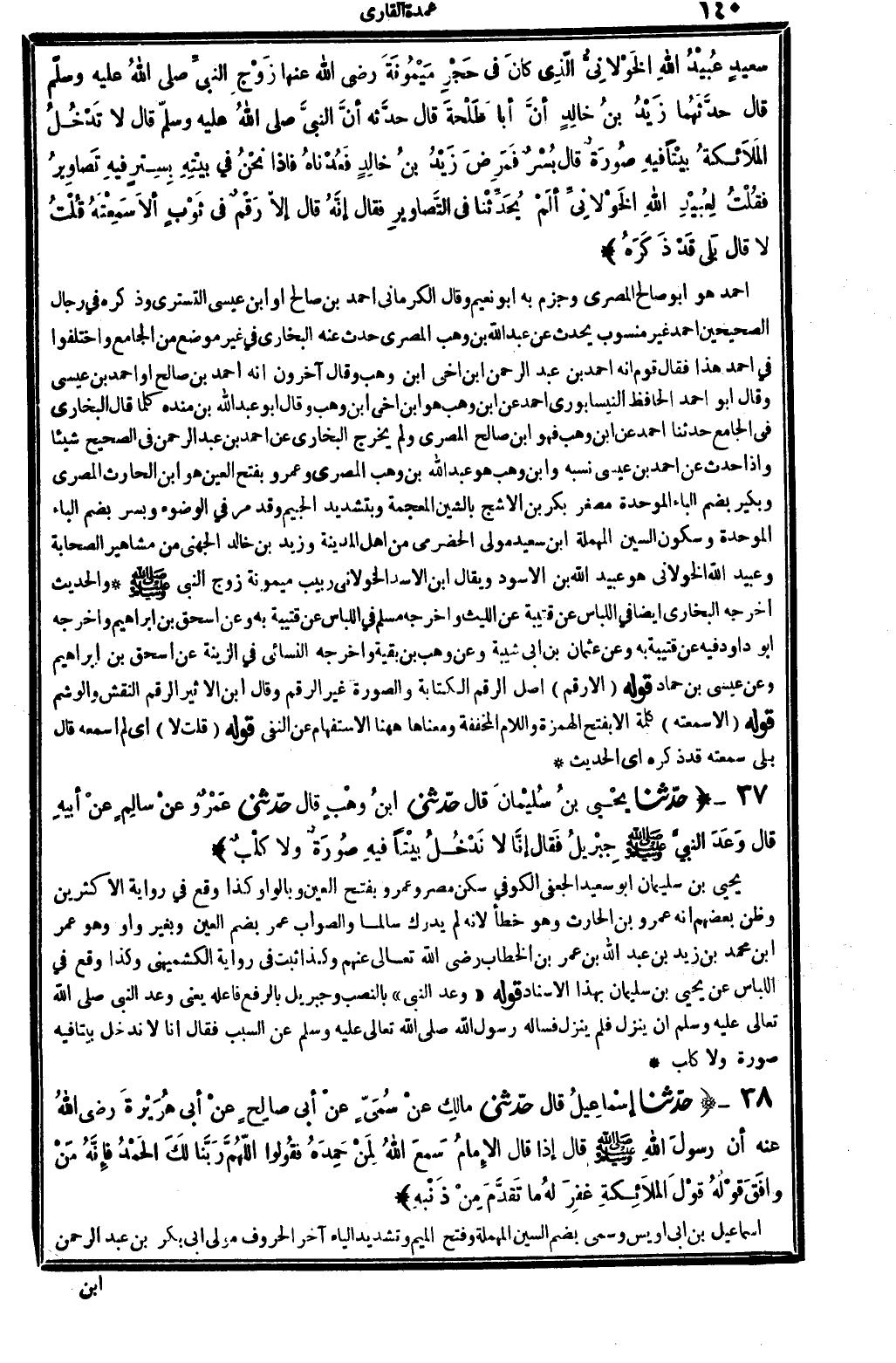 يحيى بن سُلَيْمَان أَبُو سعيد الْجعْفِيّ الْكُوفِي، سكن مصر، وَعَمْرو، بِفَتْح الْعين وبالواو كَذَا وَقع فِي رِوَايَة الْأَكْثَرين، وَظن بَعضهم أَنه عَمْرو بن الْحَارِث، وَهُوَ خطأ لِأَنَّهُ لم يدْرك سالما، وَالصَّوَاب: عمر، بِضَم الْعين وَبِغير وَاو، وَهُوَ: عمر ابْن مُحَمَّد بن زيد بن عبد الله بن عمر بن الْخطاب، رَضِي الله تَعَالَى عَنْهُم، وَكَذَا ثَبت فِي رِوَايَة الْكشميهني، وَكَذَا وَقع فِي اللبَاس عَن يحيى بن سُلَيْمَان بِهَذَا الْإِسْنَاد. قَوْله: (وعد النَّبِي) بِالنّصب، وَجِبْرِيل بِالرَّفْع فَاعله يَعْنِي وعد النَّبِي صلى الله عَلَيْهِ وَسلم، أَن ينزل فَلم ينزل، فَسَأَلَهُ رَسُول الله، صلى الله عَلَيْهِ وَسلم، عَن السَّبَب فَقَالَ: إِنَّا لَا ندخل بَيْتا فِيهِ صُورَة وَلَا كلب.
