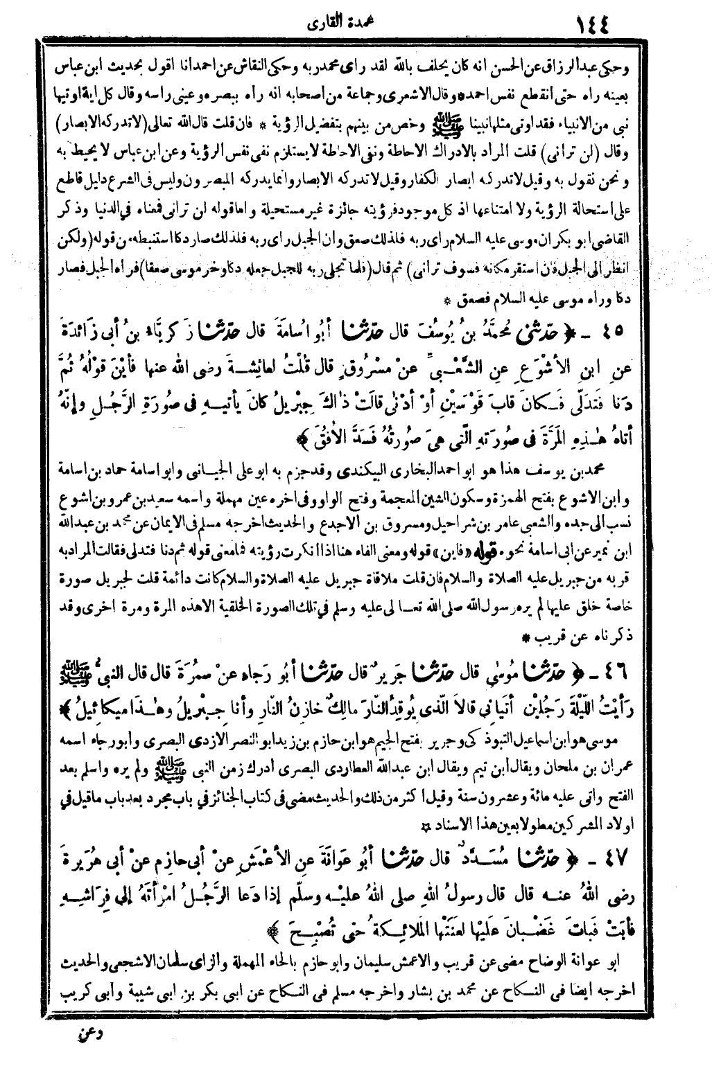 5323 - حدَّثني مُحَمَّدُ بنُ يُوسُفَ قَالَ حدَّثنا أبُو أُسَامَةَ قَالَ حدَّثنا زَكَرِيَّاءُ بنُ أبِي زَائِدَةَ عنِ ابنِ الأشْوَعِ عنِ الشَّعْبِيِّ عنْ مَسْرُوقٍ قَالَ قُلْتُ لِ عَائِشَةَ رَضِي الله تَعَالَى عنهَا فأيْنَ قَوْلُهُ {ثُمَّ دَنا فتَدَلَّى فَكانَ قَابَ قَوْسَيْنِ أوْ أدْنَى} (النَّجْم: 8 9) . قالَتْ ذااكَ جِبْرِيلُ كانَ يأتِيهِ فِي صُورَةِ الرَّجُلِ وإنَّهُ أتاهُ هاذِهِ المَرَّةَ فِي صُورَتهِ الَّتِي هِيَ صُورَتُهُ فسَدَّ الأُفُقَ. .