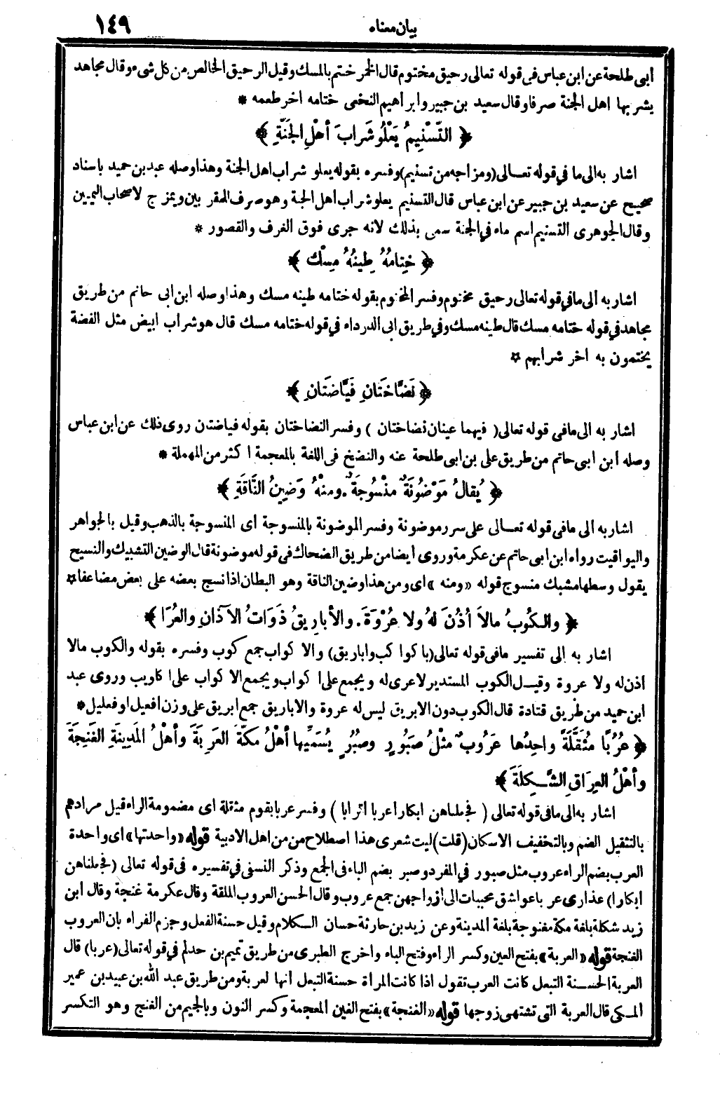 أَشَارَ بِهِ إِلَى مَا فِي قَوْله تَعَالَى: {ومزاجه من تسنيم} (المطففين: 72) . وَفَسرهُ بقوله: يَعْلُو شراب أهل الْجنَّة، وَهَذَا وَصله عبد ب حميد بِإِسْنَاد صَحِيح عَن سعيد بن جُبَير عَن ابْن عَبَّاس، قَالَ: التسنيم يَعْلُو شراب أهل الْجنَّة، وَهُوَ صرف للمقربين ويمزج لأَصْحَاب الْيَمين وَقَالَ الْجَوْهَرِي: التسنيم اسْم مَاء فِي الْجنَّة، سمي بذلك لِأَنَّهُ جرى فَوق الغرف والقصور.