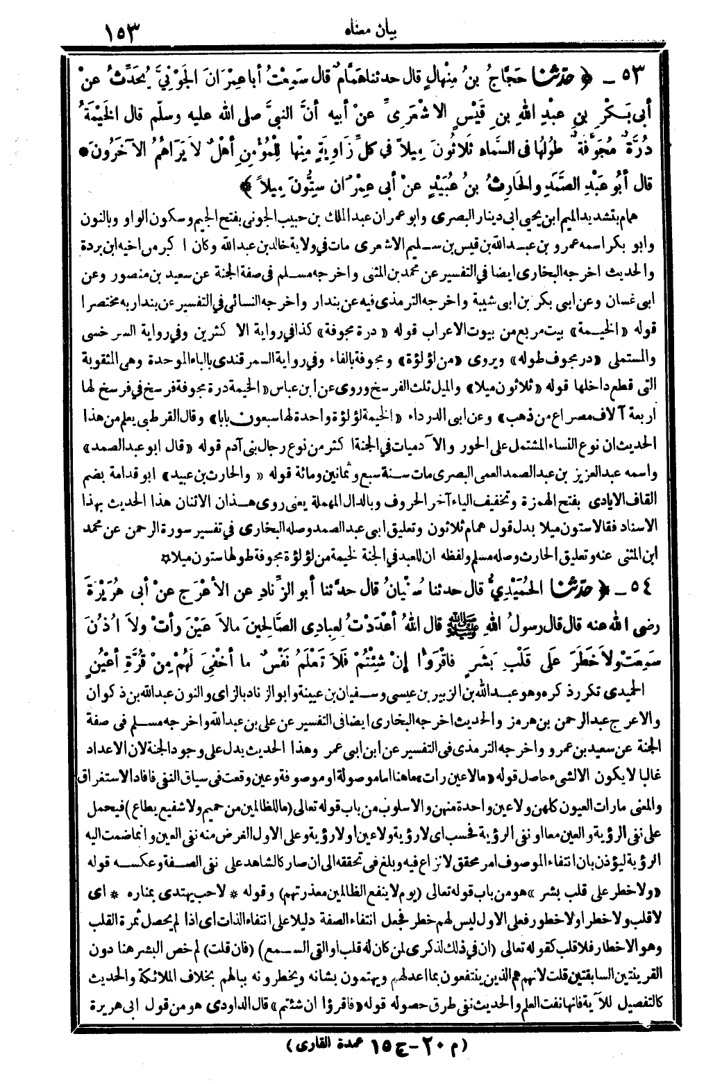 54 - (حَدثنَا الْحميدِي قَالَ حَدثنَا سُفْيَان قَالَ حَدثنَا أَبُو الزِّنَاد عَن الْأَعْرَج عَن أبي هُرَيْرَة رَضِي الله عَنهُ قَالَ قَالَ رَسُول الله - صَلَّى اللَّهُ عَلَيْهِ وَسَلَّم َ - قَالَ الله أَعدَدْت لعبادي الصَّالِحين مَا لَا عين رَأَتْ وَلَا أذن سَمِعت وَلَا خطر على قلب بشر فاقرؤا إِن شِئْتُم فَلَا تعلم نفس مَا أُخْفِي لَهُم من قُرَّة أعين) الْحميدِي تكَرر ذكره وَهُوَ عبد الله بن الزبير بن عِيسَى وسُفْيَان بن عُيَيْنَة وَأَبُو الزِّنَاد بالزاي وَالنُّون عبد الله بن ذكْوَان والأعرج عبد الرَّحْمَن بن هُرْمُز والْحَدِيث أخرجه البُخَارِيّ أَيْضا فِي التَّفْسِير عَن عَليّ بن عبد الله وَأخرجه مُسلم فِي صفة الْجنَّة عَن سعيد بن عَمْرو وَأخرجه التِّرْمِذِيّ فِي التَّفْسِير عَن ابْن أبي عمر وَهَذَا الحَدِيث يدل على وجود الْجنَّة لِأَن الإعداد غَالِبا لَا يكون إِلَّا لشَيْء حَاصِل قَوْله " مَا لَا عين رَأَتْ " مَا هُنَا إِمَّا مَوْصُولَة أَو مَوْصُوفَة وَعين وَقعت فِي سِيَاق النَّفْي فَأفَاد الِاسْتِغْرَاق وَالْمعْنَى مَا رَأَتْ الْعُيُون كُلهنَّ وَلَا عين وَاحِدَة مِنْهُنَّ والأسلوب من بَاب قَوْله تَعَالَى {مَا للظالمين من حميم وَلَا شَفِيع يطاع} فَيحمل على نفي الرُّؤْيَة وَالْعين مَعًا أَو نفي الرُّؤْيَة فَحسب أَي لَا رُؤْيَة وَلَا عين أَو لَا رُؤْيَة وعَلى الأول الْغَرَض مِنْهُ نفي الْعين وَإِنَّمَا ضمت إِلَيْهِ الرُّؤْيَة ليؤذن بِأَن انْتِفَاء الْمَوْصُوف أَمر مُحَقّق لَا نزاع فِيهِ وَبلغ فِي تحَققه إِلَى أَن صَار كالشاهد على نفي الصّفة وَعَكسه قَوْله " وَلَا خطر على قلب بشر " هُوَ من بَاب قَوْله تَعَالَى {يَوْم لَا ينفع الظَّالِمين معذرتهم} وَقَوله