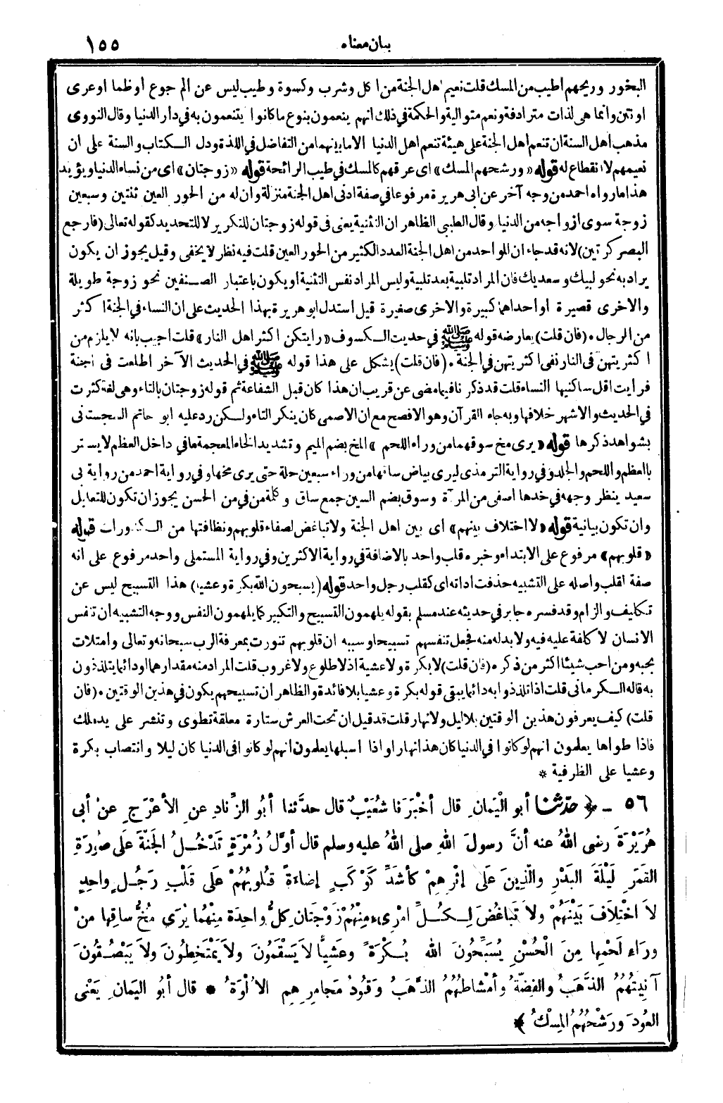 البخور وريحهم أطيب من الْمسك؟ قلت: نعيم أهل الْجنَّة من أكل وَشرب وَكِسْوَة وَطيب لَيْسَ عَن ألم جوع أَو ظمأ، أَو عري أَو نَتن، وَإِنَّمَا هِيَ لذات مترادفة وَنعم مُتَوَالِيَة، وَالْحكمَة فِي ذَلِك أَنهم ينعمون بِنَوْع مَا كَانُوا يتنعمون بِهِ فِي دَار الدُّنْيَا. وَقَالَ النَّوَوِيّ: مَذْهَب أهل السّنة أَن تنعم أهل الْجنَّة على هَيْئَة تنعم أهل الدُّنْيَا إلاَّ مَا بَينهمَا من التَّفَاضُل فِي اللَّذَّة، وَدلّ الْكتاب وَالسّنة على أَن نعيمهم لَا انْقِطَاع لَهُ. قَوْله: (ورشحهم الْمسك) أَي: عرقهم كالمسك فِي طيب الرَّائِحَة. قَوْله: (زوجتان) ، أَي: من نسَاء الدُّنْيَا، وَيُؤَيّد هَذَا مَا رَوَاهُ أَحْمد من وَجه آخر عَن أبي هُرَيْرَة مَرْفُوعا فِي صفة أدنى أهل الْجنَّة منزلَة: وَأَن لَهُ من الْحور الْعين ثِنْتَيْنِ وَسبعين زَوْجَة سوى أَزوَاجه من الدُّنْيَا، وَقَالَ الطَّيِّبِيّ: الظَّاهِر أَن التَّثْنِيَة يَعْنِي فِي قَوْله: زوجتان، للتكرير لَا للتحديد كَقَوْلِه تَعَالَى: {فأرجع الْبَصَر كرتين} (الْملك:) . لِأَنَّهُ قد جَاءَ أَن للْوَاحِد من أهل الْجنَّة الْعدَد الْكثير من الْحور الْعين. قلت: فِيهِ نظر لَا يخفى، وَقيل: يجوز أَن يكون يُرَاد بِهِ نَحْو: لبيْك وَسَعْديك، فَإِن المُرَاد تَلْبِيَة بعد تَلْبِيَة، وَلَيْسَ المُرَاد نفس التَّثْنِيَة، أَو يكون بِاعْتِبَار الصِّنْفَيْنِ نَحْو: زوجه طَوِيلَة وَالْأُخْرَى قَصِيرَة، أَو إِحْدَاهمَا كَبِيرَة وَالْأُخْرَى صَغِيرَة، قيل: اسْتدلَّ أَبُو هُرَيْرَة بِهَذَا الْإِسْنَاد على أَن النِّسَاء فِي الْجنَّة أَكثر من الرِّجَال. فَإِن قلت: يُعَارضهُ قَوْله صلى الله عَلَيْهِ وَسلم فِي حَدِيث الْكُسُوف: (رأيتكن أَكثر أهل النَّار) قلت: أُجِيب بِأَنَّهُ لَا يلْزم من أكثريتهن فِي النَّار فَفِي أكثريتهن فِي الْجنَّة. فَإِن قلت: يشكل على هَذَا قَوْله صلى الله عَلَيْهِ وَسلم فِي الحَدِيث الآخر: اطَّلَعت فِي الْجنَّة فَرَأَيْت أقل ساكنيها النِّسَاء؟ قلت: قد ذكرنَا فِيمَا مضى عَن قريب أَن هَذَا كَانَ قبل الشَّفَاعَة، ثمَّ قَوْله: زوجتان، بِالتَّاءِ وَهِي لُغَة كثرت فِي الحَدِيث، وَالْأَشْهر خلَافهَا، وَبِه جَاءَ الْقُرْآن وَهُوَ الْأَفْصَح، مَعَ أَن الْأَصْمَعِي كَانَ يُنكر التَّاء، وَلَكِن رد عَلَيْهِ أَبُو حَاتِم السجسْتانِي بشواهد ذكرهَا. قَوْله: (يُرى مخ سوقهما من وَرَاء اللَّحْم) ، المخ، بِضَم الْمِيم وَتَشْديد الْخَاء الْمُعْجَمَة: مَا فِي دَاخل الْعظم لَا يسْتَتر بالعظم وَاللَّحم وَالْجَلد، وَفِي رِوَايَة التِّرْمِذِيّ: ليرى بَيَاض سَاقهَا من وَرَاء سبعين حلَّة، حَتَّى يرى مخها. وَفِي رِوَايَة أَحْمد من رِوَايَة أبي سعيد: ينظر وَجهه فِي خدها أصفى من الْمرْآة، وسوق، بِضَم السِّين جمع: سَاق. وَكلمَة: من، فِي: من الْحسن، يجوز أَن تكون للتَّعْلِيل و: أَن، تكون بَيَانِيَّة. قَوْله: (لَا اخْتِلَاف بَينهم) ، أَي: بَين أهل الْجنَّة (وَلَا تباغض) لصفاء قُلُوبهم ونظافتها من الكدورات. قَوْله: (قُلُوبهم) ، مَرْفُوع على الِابْتِدَاء وَخَبره: قلب وَاحِد، بِالْإِضَافَة فِي رِوَايَة الْأَكْثَرين، وَفِي رِوَايَة الْمُسْتَمْلِي: وَاحِد، مَرْفُوع على أَنه صفة لقلب، وَأَصله على التَّشْبِيه حذفت أداته أَي: كقلب رجل وَاحِد. قَوْله: {يسبحون الله بكرَة وعشياً} (الْملك: 4) . هَذَا التَّسْبِيح لَيْسَ عَن تَكْلِيف وإلزام، وَقد فسره جَابر فِي حَدِيثه عِنْد مُسلم بقوله: يُلْهمُون التَّسْبِيح وَالتَّكْبِير كَمَا يُلْهمُون النَّفس، وَوجه التَّشْبِيه أَن تنفس الْإِنْسَان لَا كلفة عَلَيْهِ فِيهِ، وَلَا بُد لَهُ مِنْهُ، فَجعل تنفسهم تسبيحاً وَسَببه أَن قُلُوبهم تنورت بِمَعْرِِفَة الرب سُبْحَانَهُ وَتَعَالَى، وامتلأت بحبه، وَمن أحب شَيْئا أَكثر من ذكره. فَإِن قلت: لَا بكرَة وَلَا عَشِيَّة، إِذْ لَا طُلُوع وَلَا غرُوب. قلت