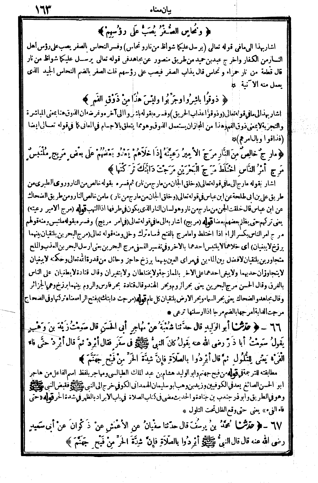 أَشَارَ بِهَذَا إِلَى مَا فِي قَوْله تَعَالَى: {يُرْسل عَلَيْكُمَا شواظ من نَار ونحاس} (الرَّحْمَن: 53) . وَفسّر النّحاس بالصفر يصب على رُؤُوس أهل النَّار من الْكفَّار، وَأخرج عبد بن حميد من طَرِيق مَنْصُور عَن مُجَاهِد فِي قَوْله تَعَالَى: {يُرْسل عَلَيْكُمَا شواظ من نَار} (الرَّحْمَن: 53) . قَالَ: قِطْعَة من نَار حَمْرَاء، و: نُحَاس، قَالَ: يذاب الصفر فَيصب على رؤوسهم. قلت: الصفر بِالضَّمِّ النّحاس الْجيد الَّذِي يعْمل مِنْهُ الْآنِية.