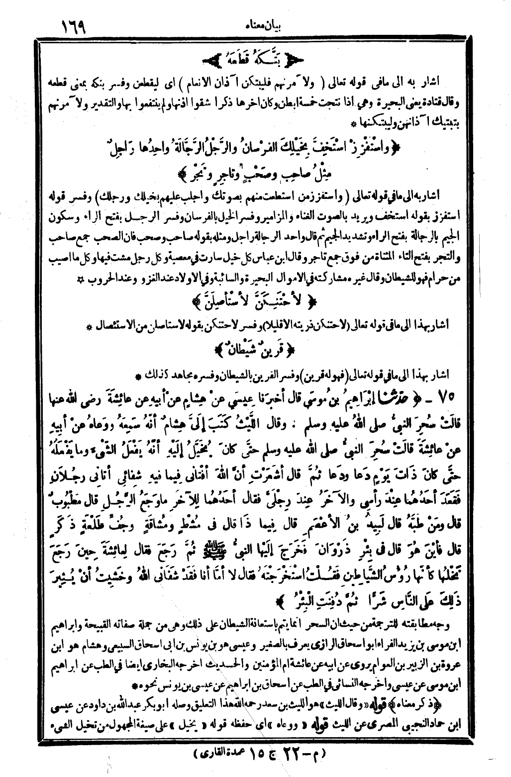 أَشَارَ بِهِ إِلَى مَا فِي قَوْله تَعَالَى: {ولآمرنَّهُم فليبتكن آذان الْأَنْعَام} (النِّسَاء: 911) . أَي: ليقطعن، وَفسّر: بتكه، بِمَعْنى: قطعه وَقَالَ قَتَادَة: يَعْنِي الْبحيرَة. وَهِي إِذا نتجت خَمْسَة أبطن، وَكَانَ آخرهَا ذكرا شَقوا أذنها، وَلم ينتفعوا بهَا، وَالتَّقْدِير: ولآمرنهم بتبتيك آذانهن، وليبتكنها.