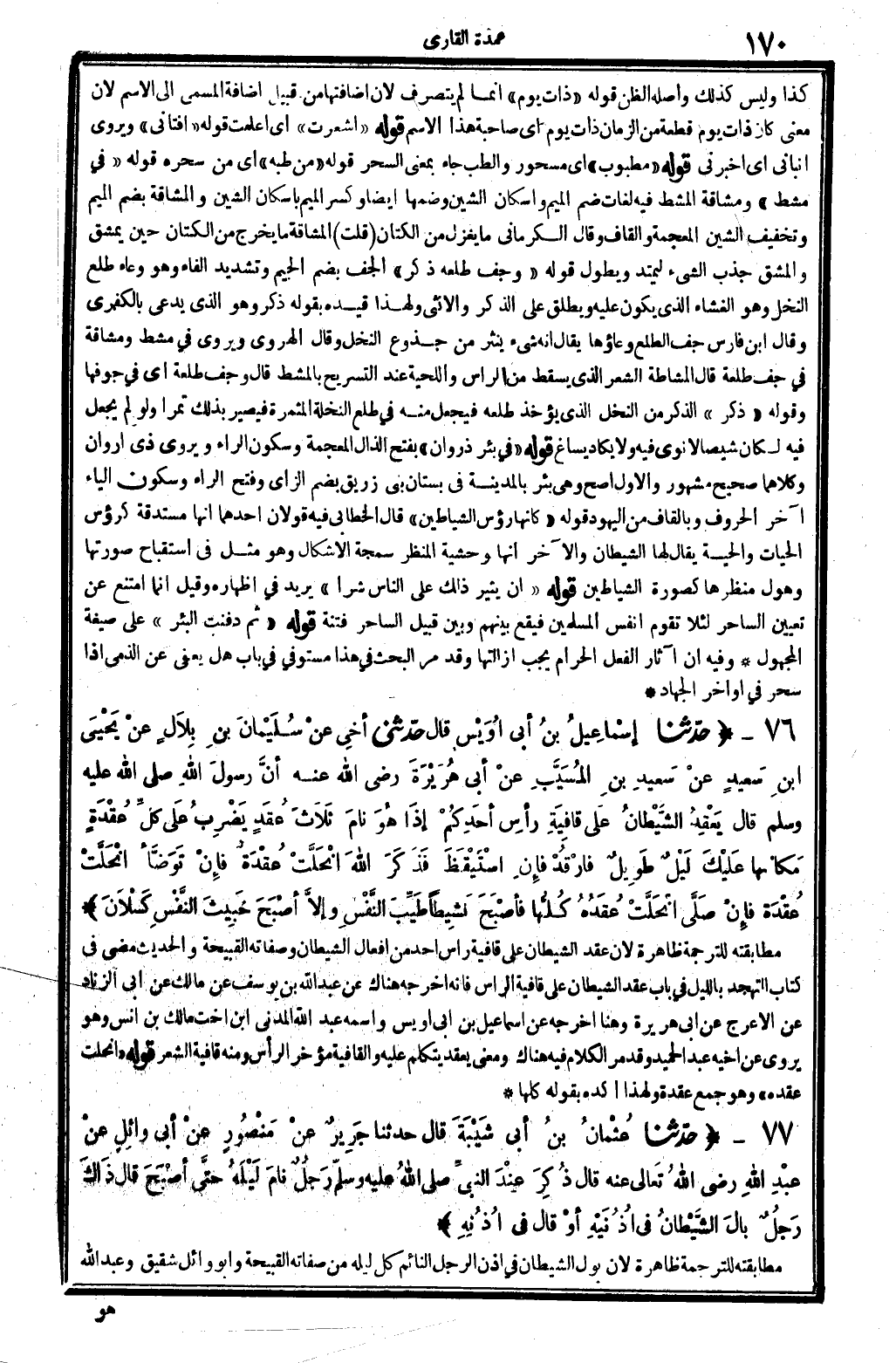 9623 - حدَّثنا إسْمَاعِيلُ بنُ أبِي أُوَيْسٍ قَالَ حدَّثني أخِي عنْ سُلَيْمَانَ بنِ بِلاَلٍ عنْ يَحْيَى ابنِ سَعِيدٍ عنْ سَعِيدِ بنِ المُسَيَّبِ عنْ أبِي هُرَيْرَةَ رَضِي الله تَعَالَى عنهُ أنَّ رسُولَ الله صلى الله عَلَيْهِ وَسلم قَالَ يَعْقِدُ الشَّيْطَانُ علَى قَافِيَةِ رأسِ أحَدِكُمْ إذَا هُوَ نامَ ثَلاَثُ عُقَدٍ يَضْرِبُ علَى كُلِّ عُقْدَةٍ مَكانها علَيْكَ لَيْلٌ طَوِيلٌ فارْقُدْ فإنِ اسْتَيْقَظَ فَذَكَرَ الله انْحَلَّتْ عُقْدَةٌ فإنْ تَوَضَّأَ انْحَلَّتْ عُقْدَة فإنْ صَلَّى انْحَلَّتْ عُقَدُهُ كُلُّها فأصْبَحَ نَشِيِطاً طَيِّبَ النَّفْسِ وإلاَّ أصْبَحَ خَبِيثَ النَّفْسِ كَسْلاَنَ. (انْظُر الحَدِيث 411) .