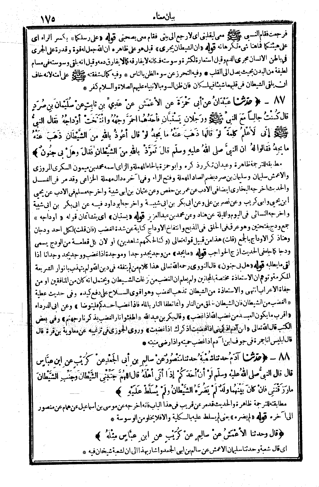 87 - (حَدثنَا عَبْدَانِ عَن أبي حَمْزَة عَن الْأَعْمَش عَن عدي بن ثَابت عَن سُلَيْمَان بن صرد قَالَ كنت جَالِسا مَعَ النَّبِي - صَلَّى اللَّهُ عَلَيْهِ وَسَلَّم َ - ورجلان يستبان فأحدهما احمر وَجهه وَانْتَفَخَتْ أوداجه فَقَالَ النَّبِي - صَلَّى اللَّهُ عَلَيْهِ وَسَلَّم َ - إِنِّي لأعْلم كلمة لَو قَالَهَا ذهب عَنهُ مَا يجد لَو قَالَ أعوذ بِاللَّه من الشَّيْطَان ذهب عَنهُ مَا يجد فَقَالُوا لَهُ إِن النَّبِي - صَلَّى اللَّهُ عَلَيْهِ وَسَلَّم َ - قَالَ تعوذ بِاللَّه من الشَّيْطَان فَقَالَ وَهل بِي جُنُون) مطابقته للتَّرْجَمَة ظَاهِرَة وعبدان تكَرر ذكره وَأَبُو حَمْزَة بِالْحَاء الْمُهْملَة وَالزَّاي اسْمه مُحَمَّد بن مَيْمُون السكرِي الْمروزِي وَالْأَعْمَش سُلَيْمَان وَسليمَان بن صرد بِضَم الصَّاد الْمُهْملَة وَفتح الرَّاء وَفِي آخِره دَال مُهْملَة الْخُزَاعِيّ وَقد مر فِي الْغسْل والْحَدِيث أخرجه البُخَارِيّ أَيْضا فِي الْأَدَب عَن عمر بن حَفْص وَعَن عُثْمَان بن أبي شيبَة وَأخرجه مُسلم فِي الْأَدَب عَن يحيى بن يحيى وَأبي كريب وَعَن نصر بن عَليّ وَعَن أبي بكر بن أبي شيبَة وَأخرجه أَبُو دَاوُد فِيهِ عَن أبي بكر بن أبي شيبَة وَأخرجه النَّسَائِيّ فِي الْيَوْم وَاللَّيْلَة عَن هناد وَعَن مُحَمَّد بن عبد الْعَزِيز قَوْله " يستبان " أَي يتشاتمان قَوْله " أوداجه " جمع ودج بِفتْحَتَيْنِ وَهُوَ عرق فِي الْحلق فِي المذبح وانتفاخ الْأَوْدَاج كِنَايَة عَن شدَّة الْغَضَب (فَإِن قلت) لكل أحد ودجان وَهنا ذكر الْأَوْدَاج بِالْجمعِ (قلت) هَذَا من قبيل قَوْله تَعَالَى {وَكُنَّا لحكمهم شَاهِدين} أَو لِأَن كل قِطْعَة من الودج يُسمى ودجا كَمَا جَاءَ فِي الحَدِيث أَزجّ الحواجب قَوْله " مَا يجد " من وجد يجد وجدا وموجدة إِذا غضب وَوجد يجد وجدانا إِذا لَقِي مَا يَطْلُبهُ قَوْله " هَل بِي جُنُون " قَالَ النَّوَوِيّ رَحمَه الله تَعَالَى هَذَا كَلَام من لم يتفقه فِي دين الله وَلم يتهذب بأنوار الشَّرِيعَة المكرمة وتوهم أَن الِاسْتِعَاذَة مُخْتَصَّة بالمجانين وَلم يعلم أَن الْغَضَب من نزغات الشَّيْطَان وَيحْتَمل أَنه كَانَ من الْمُنَافِقين أَو من جُفَاة الْأَعْرَاب انْتهى والاستعاذة من الشَّيْطَان تذْهب الْغَضَب وَهُوَ أقوى السِّلَاح على دفع كَيده وَفِي حَدِيث عَطِيَّة " الْغَضَب من الشَّيْطَان فَإِن الشَّيْطَان خلق من النَّار وَإِنَّمَا تطفأ النَّار بِالْمَاءِ فَإِذا غضب أحدكُم فَليَتَوَضَّأ " وَعَن أبي الدَّرْدَاء " أقرب مَا يكون العَبْد من غضب الله إِذا غضب " وَقَالَ بكر بن عبد الله " اطفئوا نَار الْغَضَب بِذكر نَار جَهَنَّم " وَفِي بعض الْكتب قَالَ الله تَعَالَى " ابْن آدم اذْكُرْنِي إِذا غضِبت أذكرك إِذا غضِبت " وروى الْجَوْزِيّ فِي ترغيبه عَن مُعَاوِيَة بن قُرَّة قَالَ قَالَ إِبْلِيس أَنا جَمْرَة فِي جَوف ابْن آدم إِذا غضب حميته وَإِذا رَضِي منيته -