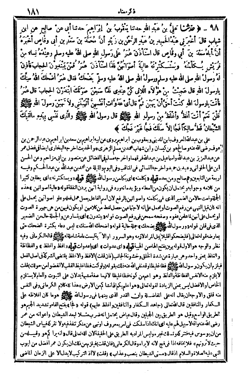 4923 - حدَّثنا عَلِيُّ بنُ عَبْدِ الله حدَّثنا يَعْقُوبُ بنُ إبْرَاهِيمَ حدَّثنا أبِي عنْ صالِحٍ عنِ ابنِ شِهَابٍ قَالَ أخْبَرَنِي عَبْدُ الْحَميدِ بنُ عَبْدِ الرَّحْمانِ بنَ زَيْدٍ أنَّ مُحَمَّدَ بنَ سَعْدِ بنِ أبِي وقَّاصٍ أخْبَرَهُ أنَّ أبَاه سَعْدَ بنَ أبِي وَقَّاصٍ قَالَ اسْتَأْذَنَ عُمَرُ علَى رَسُولِ الله صلى الله عَلَيْهِ وَسلم وعِنْدَهُ نِساءٌ مِنْ قُرَيْشٍ يُكَلِّمْنَهُ ويَسْتَكْثِرْنَهُ عالِيَةً أصْوَاتُهُنَّ فلَمَّا اسْتَأْذَنَ عُمَرُ قُمْنَ يَبْتَدِرْنَ الحِجَابَ فأذِنَ لَهُ رسُولُ الله صلى الله عَلَيْهِ وَسلم ورسُولُ الله صلى الله عَلَيْهِ وَسلم يَضْحَكُ فَقَالَ عُمَرُ أضُحَكَ الله سِنَّكَ يَا رسُولَ الله قَالَ عَجِبْتُ مِنْ هَؤُلاءِ اللاَّتِي كُنَّ عِنْدِي فلَمَّا سَمِعْنَ صَوْتَكَ ابْتَدَرْنَ الحِجَابَ قَالَ عُمَرُ فأنْتَ يَا رسولَ الله كُنْتُ أحَقَّ أنْ يَهَبْنَ ثُمَّ قَالَ أَي عَدُوَّاتِ أنْفُسِهِنَّ أتَهَبْنَنِي ولاَ تَهَبْنَ رسُولَ الله صلى الله عَلَيْهِ وَسلم قُلْنَ نَعَمْ أنْتَ أفَظُّ وأغْلَظُ مِنْ رَسُولِ الله صلى الله عَلَيْهِ وَسلم قَالَ رسُولُ الله صلى الله عَلَيْهِ وَسلم والَّذِي نَفْسِي بِيَدِهِ مَا لَقِيَكَ الشَّيْطَانُ قَطُّ سالِكَاً فَجَّاً إلاَّ سَلَكَ فَجَّاً غَيْرَ فَجِّكَ.