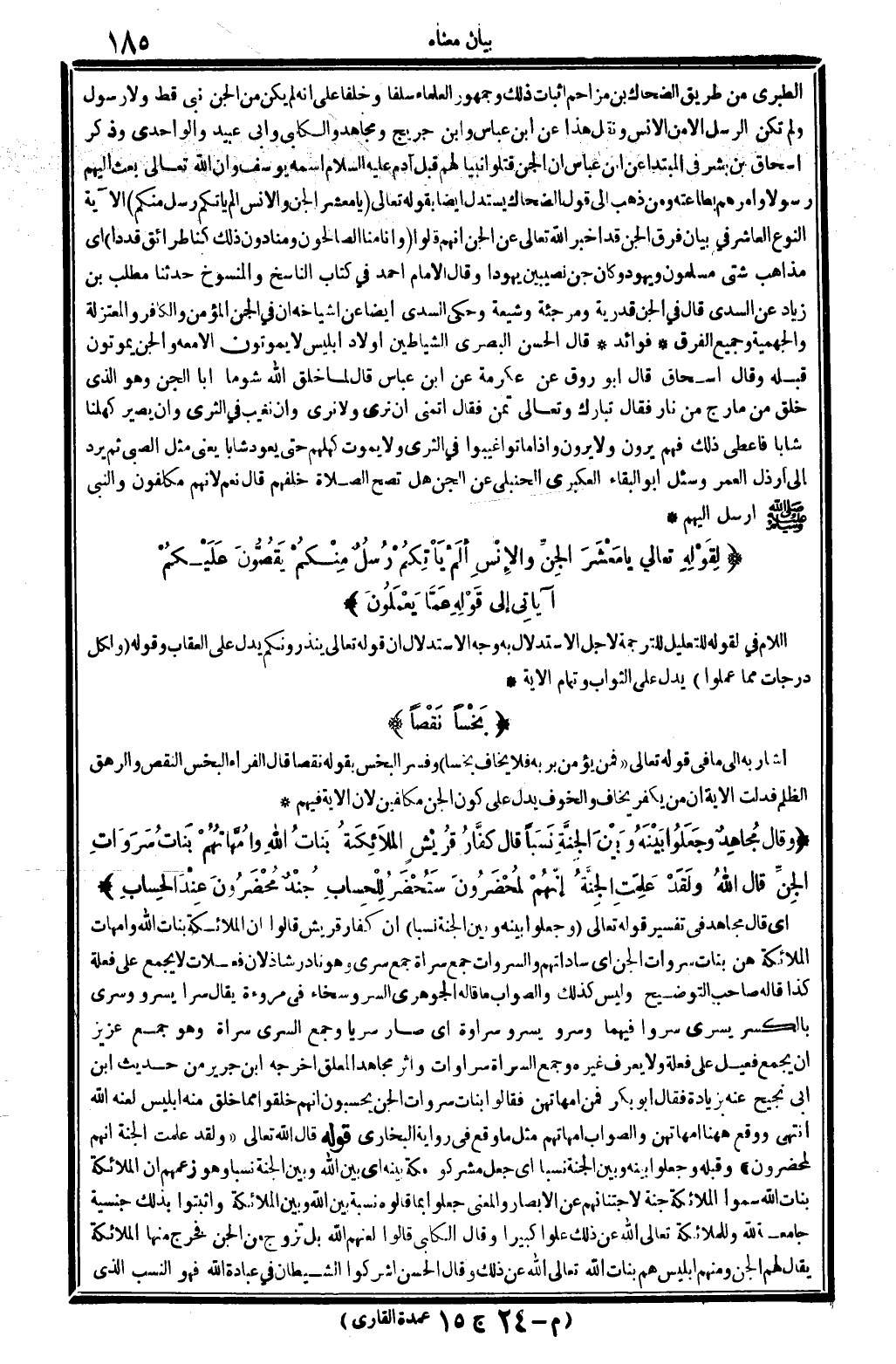 الطَّبَرِيّ من طَرِيق الضَّحَّاك بن مُزَاحم، إِثْبَات ذَلِك، وَجُمْهُور الْعلمَاء سلفا وخلفاً على أَنه لم يكن من الْجِنّ نَبِي قطّ وَلَا رَسُول، وَلم تكن الرُّسُل إلاَّ من الْإِنْس، وَنقل هَذَا عَن ابْن عَبَّاس وَابْن جريج وَمُجاهد والكلبي وَأبي عبيد والواحدي، وَذكر إِسْحَاق بن بشر فِي (الْمُبْتَدَأ) : عَن ابْن عَبَّاس أَن الْجِنّ قتلوا نَبيا لَهُم قبل آدم، عَلَيْهِ الصَّلَاة وَالسَّلَام، اسْمه يُوسُف، وَأَن الله تَعَالَى بعث إِلَيْهِم رَسُولا وَأمرهمْ بِطَاعَتِهِ. وَمن ذهب إِلَى قَول الضَّحَّاك يسْتَدلّ أَيْضا بقوله تَعَالَى: {يَا معشر الْجِنّ وَالْإِنْس ألم يأتكم رسل مِنْكُم ... } (الْأَنْعَام: 031) . الْآيَة.