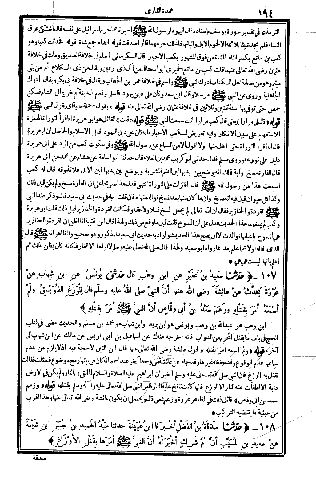 التِّرْمِذِيّ فِي تَفْسِير سُورَة يُوسُف بِإِسْنَادِهِ قَالَ الْيَهُود لرَسُول الله - صَلَّى اللَّهُ عَلَيْهِ وَسَلَّم َ - أخبرنَا عَمَّا حرم إِسْرَائِيل على نَفسه قَالَ اشْتَكَى عرق النِّسَاء فَلم يجد شَيْئا يلائمه إِلَّا لُحُوم الْإِبِل وَأَلْبَانهَا فَلذَلِك حرمهما قَالُوا صدقت قَوْله الشَّاء جمع شَاة قَوْله فَحدثت كَعْبًا وَهُوَ كَعْب بن ماتع بِكَسْر التَّاء الْمُثَنَّاة من فَوق الْمَشْهُور بكعب الْأَحْبَار قَالَ الْكرْمَانِي أسلم فِي خلَافَة الصّديق وَمَات فِي خلَافَة عُثْمَان رَضِي الله تَعَالَى عَنْهُمَا قلت كَعْب بن ماتع الْحِمْيَرِي أَبُو إِسْحَاق من آل ذِي رعين وَيُقَال من ذِي الكلاع ثمَّ من بني ميتم وَهُوَ من مسلمة أهل الْكتاب أدْرك النَّبِي - صَلَّى اللَّهُ عَلَيْهِ وَسَلَّم َ - وَأسلم فِي خلَافَة عمر بن الْخطاب وَيُقَال فِي خلَافَة أبي بكر وَيُقَال أدْرك الْجَاهِلِيَّة وروى عَن النَّبِي - صَلَّى اللَّهُ عَلَيْهِ وَسَلَّم َ - مُرْسلا وَقَالَ ابْن سعد وَكَانَ على دين يهود فَأسلم وَقدم الْمَدِينَة ثمَّ خرج إِلَى الشَّام فسكن حمص حَتَّى توفّي بهَا سنة ثِنْتَيْنِ وَثَلَاثِينَ فِي خلَافَة عُثْمَان رَضِي الله تَعَالَى عَنهُ قَوْله " يَقُول " جملَة حَالية أَي يَقُول النَّبِي - صَلَّى اللَّهُ عَلَيْهِ وَسَلَّم َ - قَوْله " قَالَ لي مرَارًا " يَعْنِي قَالَ كَعْب مرَارًا أَنْت سَمِعت النَّبِي - صَلَّى اللَّهُ عَلَيْهِ وَسَلَّم َ - قَوْله " قلت " الْقَائِل هُوَ أَبُو هُرَيْرَة أفأقرأ التَّوْرَاة الْهمزَة للاستفهام على سَبِيل الْإِنْكَار وَفِيه تَعْرِيض لكعب الْأَحْبَار بِأَنَّهُ كَانَ على دين الْيَهُود قبل الْإِسْلَام وَالْحَاصِل أَن أَبَا هُرَيْرَة قَالَ أَنا أَقرَأ التَّوْرَاة حَتَّى أنقل مِنْهَا وَلَا أَقُول إِلَّا من السماع عَن رَسُول الله - صَلَّى اللَّهُ عَلَيْهِ وَسَلَّم َ - وَفِي سكُوت كَعْب عَن الرَّد على أبي هُرَيْرَة دَلِيل على تورعه وروى مُسلم فَقَالَ حَدثنِي أَبُو كريب مُحَمَّد بن الْعَلَاء قَالَ حَدثنَا أَبُو أُسَامَة عَن هِشَام عَن مُحَمَّد عَن أبي هُرَيْرَة قَالَ الْفَأْرَة مسخ وَآيَة ذَلِك أَنه يوضع بَين يَديهَا لبن الْغنم فتشربه وَيُوضَع بَين يَديهَا لبن الْإِبِل فَلَا تذوقه قَالَ لَهُ كَعْب أسمعت هَذَا من رَسُول الله - صَلَّى اللَّهُ عَلَيْهِ وَسَلَّم َ - قَالَ أفأنزلت على التَّوْرَاة انْتهى فَدلَّ هَذَا صَرِيحًا على أَن الْفَأْرَة مسخ وَلم يكن قبل ذَلِك وَكَذَا كل حَيَوَان قيل فِيهِ أَنه مسخ وَأَن مَا كَانَ مِنْهَا بعد المسخ توالد مِنْهَا فَإِن قلت جَاءَ فِي حَدِيث أبي سعيد قَالَ وَذكر عِنْد النَّبِي - صَلَّى اللَّهُ عَلَيْهِ وَسَلَّم َ - القردة والخنازير فَقَالَ إِن الله تَعَالَى لم يَجْعَل لمسخ نَسْلًا وَلَا عقبا وَقد كَانَت القردة والخنازير قبل ذَلِك قلت أَبُو هُرَيْرَة وَكَعب لم يبلغهما هَذَا الحَدِيث فَدلَّ على أَن المسوخ كَانَت قبل مَا وَقع من ذَلِك وَلِهَذَا قَالَ ابْن قُتَيْبَة أَنا أَظن أَن القردة والخنازير هِيَ المسوخ بِأَعْيَانِهَا توالدت إِلَّا أَن يَصح هَذَا الحَدِيث وَأَرَادَ بِهِ حَدِيث أبي سعيد الْمَذْكُور وَهُوَ صَحِيح وَالظَّاهِر أَنه - صَلَّى اللَّهُ عَلَيْهِ وَسَلَّم َ - قَالَ الَّذِي قَالَه أَولا ثمَّ أعلم بعد بِمَا رَوَاهُ أَبُو سعيد وَلِهَذَا قَالَ - صَلَّى اللَّهُ عَلَيْهِ وَسَلَّم َ - لَا أَرَاهَا إِلَّا الفأر فَكَأَنَّهُ كَانَ يظنّ ذَلِك ثمَّ أعلم بِأَنَّهَا لَيست هِيَ هِيَ - (قلت) ، الْقَائِل هُوَ أَبُو هُرَيْرَة: (افأقرأ التَّوْرَاة؟) الْهمزَة للاستفهام على سَبِيل الْإِنْكَار.