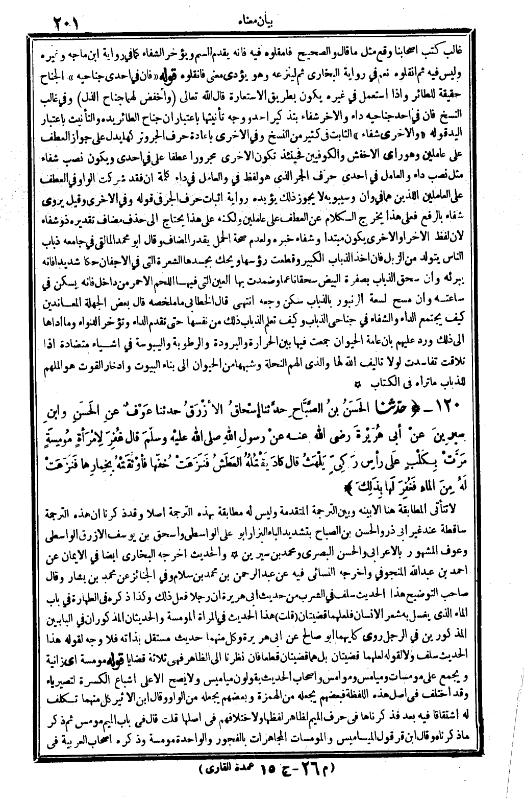 غَالب كتب أَصْحَابنَا وَقع مثل مَا قَالَ، وَالصَّحِيح: فامقلوه فِيهِ، فَإِنَّهُ يقدم السم وَيُؤَخر الشِّفَاء، كَمَا فِي رِوَايَة ابْن مَاجَه وَغَيره، وَلَيْسَ فِيهِ: ثمَّ انقلوه، نعم، فِي رِوَايَة البُخَارِيّ: لم لينزعه، وَهُوَ يُؤَدِّي معنى: فانقلوه. قَوْله: (فَإِن فِي إِحْدَى جناحيه) ، الجناج حَقِيقَة للطائر، وَإِذا اسْتعْمل فِي غَيره يكون بطرِيق الِاسْتِعَارَة، قَالَ الله تَعَالَى: {واخفض لَهما جنَاح الذل} (الْإِسْرَاء: 42) . وَفِي غَالب النّسخ: فَإِن فِي أحد جناحيه دَاء وَالْآخر شِفَاء، بتذكير: أحد، وَوجه تأنيثها بِاعْتِبَار أَن جنَاح الطَّائِر يَده، والتأنيث بِاعْتِبَار الْيَد. قَوْله: (وَالْأُخْرَى شِفَاء) ، الثَّابِت فِي كثير من النّسخ، وَفِي الْأُخْرَى، بِإِعَادَة حرف الْجَرّ، وَتركهَا يدل على جَوَاز الْعَطف على عاملين، وَهُوَ رَأْي الْأَخْفَش والكوفيين، فَحِينَئِذٍ تكون: الْأُخْرَى، مجروراً عطفا على: فِي إِحْدَى، وَيكون نصب: شِفَاء، مثل نصب: دَاء، وَالْعَامِل فِي: إِحْدَى، حرف الْجَرّ الَّذِي هُوَ لفظ: فِي، وَالْعَامِل فِي: دَاء، كلمة: إِن، فقد شركت الْوَاو فِي الْعَطف على العاملين اللَّذين هما: فِي وان، وسيبويه لَا يجوّز ذَلِك، يُؤَيّدهُ رِوَايَة إِثْبَات حرف الْجَرّ فِي قَوْله: وَفِي الْأُخْرَى، وَقيل: يرْوى شِفَاء، بِالرَّفْع، فعلى هَذَا يخرج الْكَلَام عَن الْعَطف على عاملين، وَلكنه على هَذَا يحْتَاج إِلَى حذف مُضَاف تَقْدِيره: ذُو شِفَاء، لِأَن لفظ الآخر أَو الْأُخْرَى يكون مُبْتَدأ، وشفاء خَبره، وَلعدم صِحَة الْحمل يقدر الْمُضَاف، وَقَالَ أَبُو مُحَمَّد المالقي فِي (جَامعه) : ذُبَاب النَّاس يتَوَلَّد من الزبل، فَإِن أَخذ الذُّبَاب الْكَبِير وَقطعت رؤوسها وَيحك بجسدها الشعرة الَّتِي فِي الأجفان حكاً شَدِيدا فَإِنَّهُ يُبرئهُ، وَإِن سحق الذُّبَاب بصفرة الْبيض سحقاً نَاعِمًا وضمدت بهَا الْعين الَّتِي فِيهَا اللَّحْم الْأَحْمَر من دَاخل فَإِنَّهُ يسكن فِي سَاعَته، وَإِن مسح لسعة الزنبور بالذباب سكن وَجَعه. انْتهى. قَالَ الْخطابِيّ مَا ملخصه: قَالَ بعض الجهلة المعاندين: كَيفَ يجْتَمع الدَّاء والشفاء فِي جناحي الذُّبَاب؟ وَكَيف تعلم الذُّبَاب ذَلِك من نَفسهَا حَتَّى تقدم الدَّاء وتؤخر الدَّوَاء؟ وَمَا أَدَّاهَا إِلَى ذَلِك؟ ورد عَلَيْهِم: بِأَن عَامَّة الْحَيَوَان جمعت فِيهَا بَين الْحَرَارَة والبرودة والرطوبة واليبوسة فِي أَشْيَاء متضادة إِذا تلاقت تفاسدت لَوْلَا تأليف الله لَهَا، وَالَّذِي ألهم النحلة وَشبههَا من الْحَيَوَان إِلَى بِنَاء الْبيُوت وادخار الْقُوت هُوَ الملهم للذباب مَا ترَاهُ فِي الْكتاب.