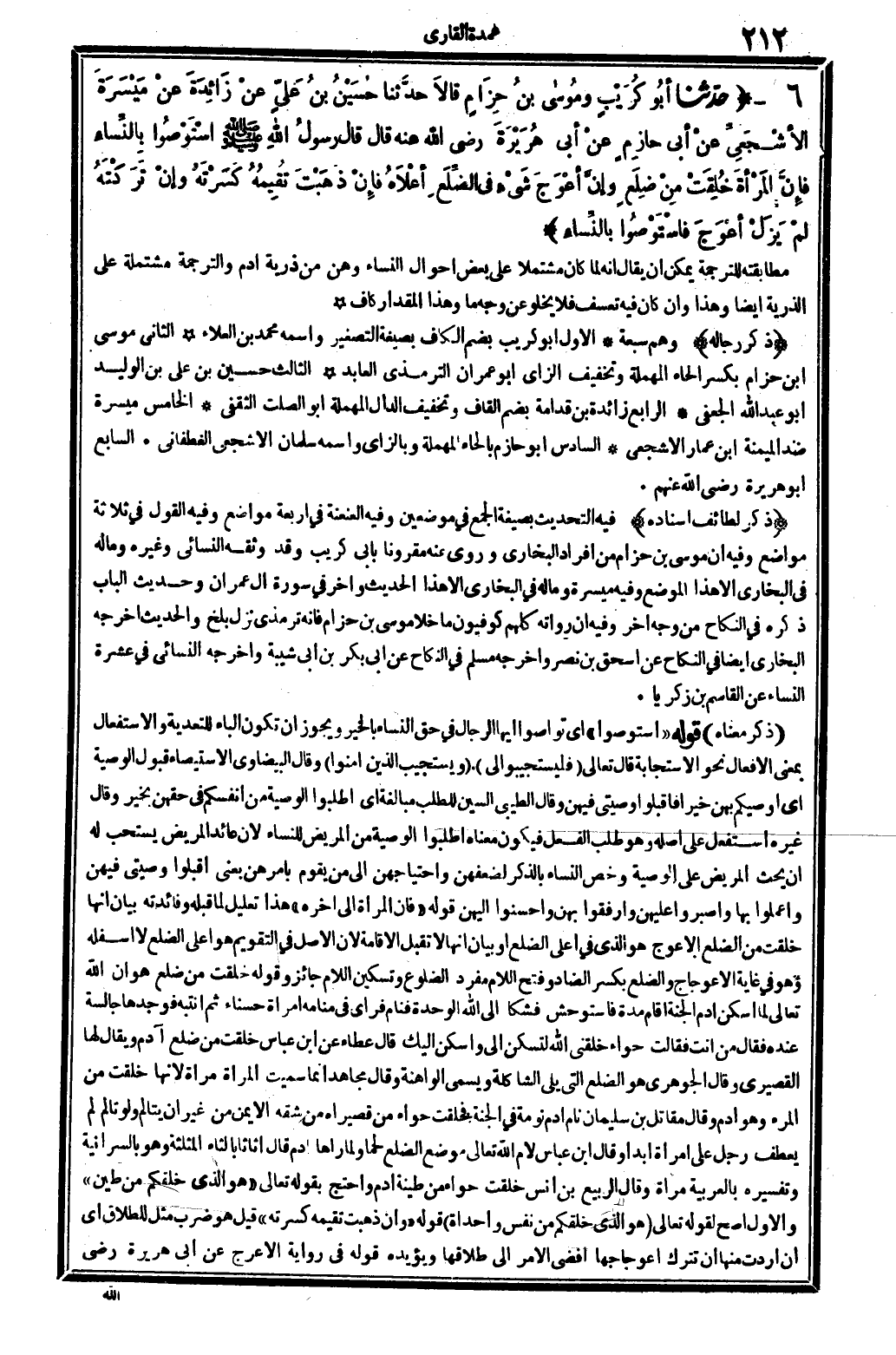 ذكر رِجَاله وهم سَبْعَة: الأول: أَبُو كريب، بِضَم الْكَاف بِصِيغَة التصغير: واسْمه مُحَمَّد بن الْعَلَاء. الثَّانِي: مُوسَى ابْن حزَام، بِكَسْر الْحَاء الْمُهْملَة وَتَخْفِيف الزَّاي: أَبُو عمرَان التِّرْمِذِيّ العابد. الثَّالِث: حُسَيْن بن عَليّ بن الْوَلِيد أَبُو عبد الله الْجعْفِيّ. الرَّابِع: زَائِدَة بن قدامَة، بِضَم الْقَاف وَتَخْفِيف الدَّال الْمُهْملَة: أَبُو الصَّلْت الثَّقَفِيّ. الْخَامِس: ميسرَة ضد الميمنة ابْن عمار الْأَشْجَعِيّ. السَّادِس: أَبُو حَازِم، بِالْحَاء الْمُهْملَة وبالزاي: واسْمه سلمَان الْأَشْجَعِيّ الْغَطَفَانِي. السَّابِع: أَبُو هُرَيْرَة، رَضِي الله تَعَالَى عَنْهُم.