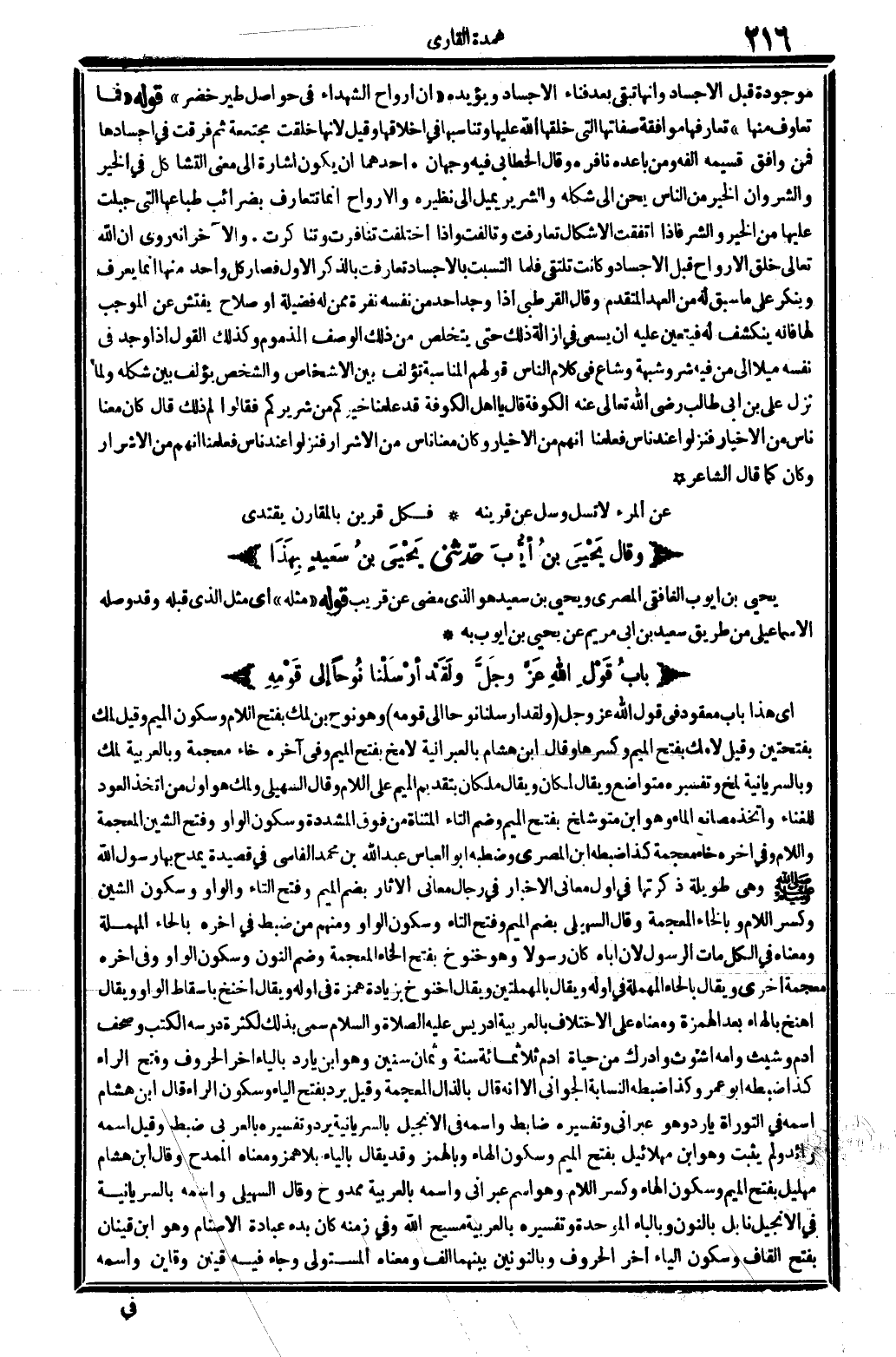 مَوْجُودَة قبل الأجساد وَإِنَّهَا تبقى بعد فنَاء الأجساد وَيُؤَيِّدهُ " أَن أَرْوَاح الشُّهَدَاء فِي حواصل طير خضر " قَوْله " فَمَا تعارف مِنْهَا " تعارفها مُوَافقَة صفاتها الَّتِي خلقهَا الله عَلَيْهَا وتناسبها فِي أخلاقها وَقيل لِأَنَّهَا خلقت مجتمعة ثمَّ فرقت فِي أجسادها فَمن وَافق قسيمه أَلفه وَمن باعده نافره وَقَالَ الْخطابِيّ فِيهِ وَجْهَان. أَحدهمَا أَن يكون إِشَارَة إِلَى معنى التشاكل فِي الْخَيْر وَالشَّر وَإِن الْخَيْر من النَّاس يحن إِلَى شكله والشرير يمِيل إِلَى نَظِيره والأرواح إِنَّمَا تتعارف بضرائب طباعها الَّتِي جبلت عَلَيْهَا من الْخَيْر وَالشَّر فَإِذا اتّفقت الأشكال تعارفت وتألفت وَإِذا اخْتلفت تنافرت وتناكرت. وَالْآخر أَنه رُوِيَ أَن الله تَعَالَى خلق الْأَرْوَاح قبل الأجساد وَكَانَت تلتقي فَلَمَّا التسبت بالأجساد تعارفت بِالذكر الأول فَصَارَ كل وَاحِد مِنْهَا إِنَّمَا يعرف وينكر على مَا سبق لَهُ من الْعَهْد الْمُتَقَدّم وَقَالَ الْقُرْطُبِيّ إِذا وجد أحد من نَفسه نفرة مِمَّن لَهُ فَضِيلَة أَو صَلَاح يفتش عَن الْمُوجب لَهَا فَإِنَّهُ ينْكَشف لَهُ فَيتَعَيَّن عَلَيْهِ أَن يسْعَى فِي إِزَالَة ذَلِك حَتَّى يتَخَلَّص من ذَلِك الْوَصْف المذموم وَكَذَلِكَ القَوْل إِذا وجد فِي نَفسه ميلًا إِلَى من فِيهِ شَرّ وشبهة وشاع فِي كَلَام النَّاس قَوْلهم الْمُنَاسبَة تؤلف بَين الْأَشْخَاص والشخص يؤلف بَين شكله وَلما نزل عَليّ بن أبي طَالب رَضِي الله تَعَالَى عَنهُ الْكُوفَة قَالَ يَا أهل الْكُوفَة قد علمنَا خَيركُمْ من شريركم فَقَالُوا لم ذَلِك قَالَ كَانَ مَعنا نَاس من الأخيار فنزلوا عِنْد نَاس فَعلمنَا أَنهم من الأخيار وَكَانَ مَعنا نَاس من الأشرار فنزلوا عِنْد نَاس فَعلمنَا أَنهم من الأشرار وَكَانَ كَمَا قَالَ الشَّاعِر