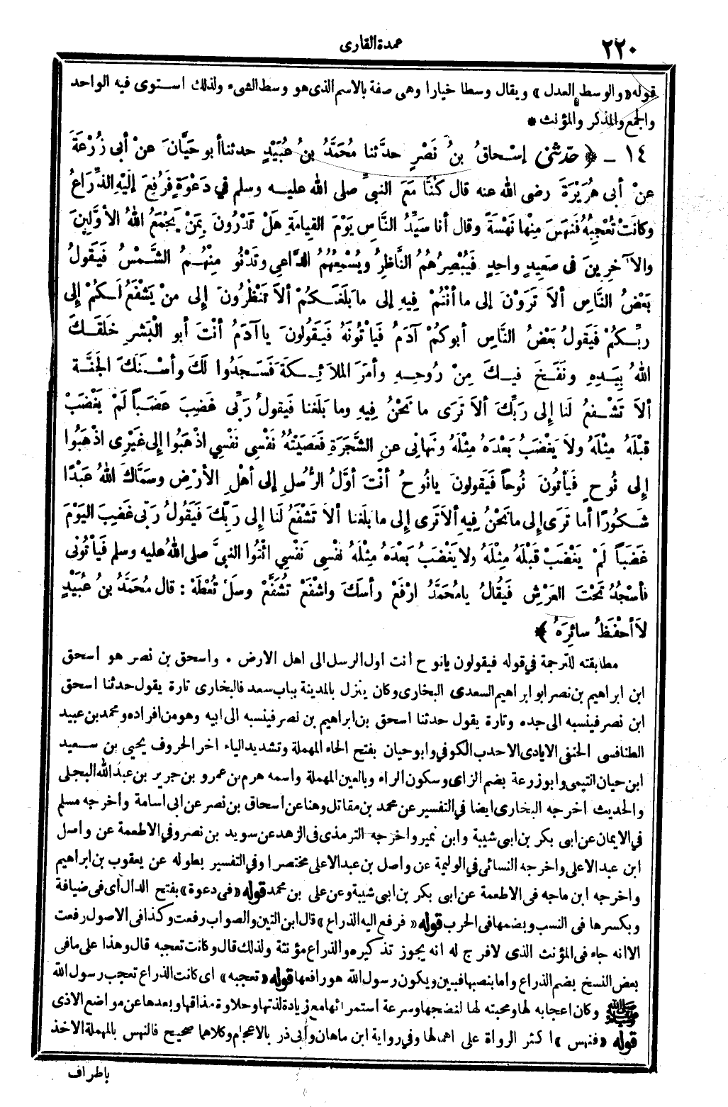 0433 - حدَّثني إسْحَاقُ بنُ نَصْرٍ حدَّثنا مُحَمَّدُ بنُ عُبَيْدٍ حدَّثنا أَبُو حَيَّانَ عنْ أبِي زُرْعَةَ عنْ أبِي هُرَيْرَةَ رَضِي الله تَعَالَى عنهُ قَالَ كُنَّا مَعَ النَّبِيِّ صلى الله عَلَيْهِ وَسلم فِي دَعْوَةٍ فَرُفِعَ إلَيْهِ الذِّرَاعُ وكانَتْ تُعْجِب فنَهَسَ مِنْهَا نَهْسَةً وَقَالَ أنَا سَيِّدُ النَّاسِ يَوْمَ القِيَامَةِ هَلْ تَدْرُونَ بِمَنْ يَجْمَعُ الله الأوَّلِينَ والآخَرِينَ فِي صَعِيدٍ واحِدٍ فيُبْصِرُهُمُ النَّاظِرُ ويُسْمِعُهُمْ الدَّاعِي وتَدْنُو مِنْهُمُ الشَّمْسُ فيَقُولُ بَعْضُ النَّاسِ ألاَ تَرَوْنَ إلَى مَا أنْتُمْ فِيهِ إِلَى مَا بَلَغَكُمْ ألاَ تَنْظُرُونَ إِلَى مَنْ يَشْفَعُ لَكُمْ إِلَى رَبِّكُمْ فيَقُولُ بَعْضُ النَّاسِ أبُوكُمْ آدَمُ فَيأتُونَهُ فيَقُولُونَ يَا آدَمُ أنْتَ أَبُو البَشَرِ خَلَقَكَ الله بِيَدِهِ ونَفَخَ فِيكَ مِنْ رُوحِهِ وأمَرَ المَلائِكَةَ فسَجَدُوا لَكَ وأسْكنَكَ الجَنَّةَ ألاَ تَشْفَعُ لَنَا إلَى رَبِّكَ ألاَ تَرَى مَا نَحْنُ فِيهِ وَمَا بَلَغَنَا فَيقُولُ رَبِّي غَضِبَ غَضَباً لَمْ يَغْضَبْ قبلَهُ مِثْلَهُ ولاَ يَغْضَبُ بَعْدَهُ مِثْلَهُ ونَهَانِي عنِ الشَّجَرَةِ فَعَصَيْتُهُ نَفْسِي اذْهَبُوا إلَى غَيْرِي اذْهَبُوا إِلَى نُوحٍ فَيأتُونَ نُوحَاً فيَقُولُونَ يَا نوحُ أنْتَ أوَّلُ الرُّسُلِ إِلَى أهْلِ الأرْضِ وسَمَّاكَ الله عَبْدَاً شَكُوراً أمَا تَرَى إلَى مَا نَحْنُ فِيهِ ألاَ تَرَى إلَى مَا بَلَغنا ألاَ تَشْفَعُ لَنَا إلَى رَبِّكَ فيَقُولُ رَبِّي غَضِبَ اليَوْمَ غَضَباً لَمْ يَغْضَبْ قَبْلَهُ مِثْلَهُ ولاَ يَغْضَبْ قَبْلَهُ مِثْلَهُ ولاَ يَغْضَبُ بَعْدَهُ مِثْلَهُ نَفْسِي نَفْسِي ائْتُوا النَّبِيَّ صلى الله عَلَيْهِ وَسلم فَيأتُونِي فأسْجُدُ تَحْتَ العَرْشِ فَيُقالُ يَا مُحَمَّدُ ارْفَعْ رأسَكَ واشْفَعْ تُشَفَّعْ وسَلْ تُعْطَهْ: قَالَ مُحَمَّدُ بنُ عُبَيْدٍ لاَ أحْفَظُ سائِرَهُ.
