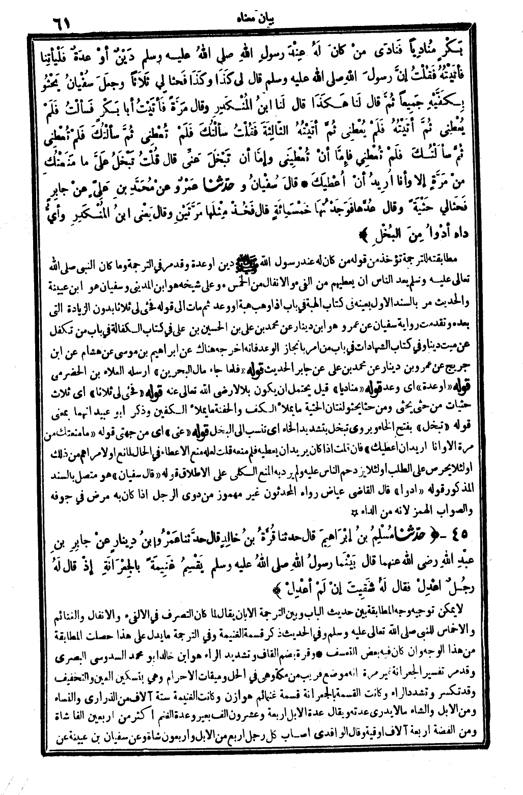 بَكْرٍ مُنَادِيَاً فَنادَى مَنْ كانَ لَهُ عِنْدَ رسُولِ الله صلى الله عَلَيْهِ وَسلم دَيْنٌ أوْ عدَةٌ فلْيَأْتِنَا فأتَيْتُهُ فقُلْتُ إنَّ رسولَ الله صلى الله عَلَيْهِ وَسلم قَالَ لي كَذَا وكذَا فَحَثا لِي ثَلاثاً وجعَلَ سُفْيَانُ يَحْثُو بِكَفَّيْهِ جَمِيعاً ثُمَّ قَالَ لَنَا هَكَذَا قَالَ لَنَا ابنُ الْمُنْكَدِرِ وَقَالَ مَرَّةً فأتَيْتُ أَبَا بَكْرٍ فَسَألْتُ فلَمْ تُعْطِنِي أَتَيْته فَلم يُعْطِنِي ثمَّ أَتَيْته الثَّالِثَة فَقلت سَأَلتك فَلم تعطني ثُمَّ سألْتُكَ فَلَمْ تُعْطِنِي فإمَّا أنْ تُعْطِينِي وإمَّا أنْ تَبْخَلَ عَنِّي قَالَ قُلْتُ تَبْخَلُ علَيَّ مَا مَنَعْتُكِ مِنْ مَرَّةٍ إلاَّ وَأَنا أُرِيدُ أنْ أُعْطِيَكَ. قَالَ سُفْيَانُ وحدَّثنا عَمْرٌ وعنْ مُحَمَّدِ بنِ عَلِيٍّ عنْ جابِرٍ فَحَثَا لي حَثْيَةً وَقَالَ عُدَّهَا فوَجَدْتُهَا خَمْسَمِائَةٍ قَالَ فَخُذْ مِثْلَهَا مَرَّتَيْنِ وَقَالَ يَعْنِي ابنُ الْمُنْكَدِرِ وأيُّ داءٍ أدُوأا مِنَ البُخْلِ. .