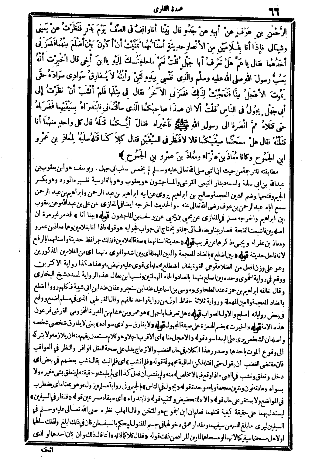 الرَّحْمانِ بنِ عَوْفٍ عنْ أبِيهِ عنْ جَدِّهِ قَالَ بَيْنَا أَنا واقِفٌ فِي الصَّفِّ يَوْمَ بَدْرٍ فنَظَرْتُ عَنْ يَمِينِي وشِمَالِي فإذَا أَنا بِغُلامَيْنِ مِنَ الأنْصَارِ حدِيثَةٍ أسْنَانُهُمَا تَمَنَّيْتُ أنْ أكُونَ بَيْنَ أضْلَعَ مِنْهُمَا فغَمَزَنِي أحَدُهُمَا فَقَالَ يَا عَمِّ هَلْ تَعْرِفُ أبَا جَهْلٍ قُلْتُ نَعَمْ مَا حاجَتُكَ إلَيْهِ يَا ابنَ أخِي قَالَ أُخْبِرْت أنَّهُ يَسُبُّ رسولَ الله صلى الله عَلَيْهِ وَسلم والَّذِي نَفْسِي بِيَدِهِ لَئِنْ رأيْتُهُ لاَ يُفارِقُ سَوَادِي سَوادَهُ حتَّى يَمُوتَ الأعْجَلُ مِنَّا فتَعَجَّبْتُ لِذَلِكَ فَغَمَزَنِي الآخَرُ فَقَالَ لِي مِثْلَها فلَمْ أنْشَبْ أنْ نَظَرْتُ إِلَى أبِي جَهْلٍ يَجُولُ فِي النَّاسِ قُلْتُ أَلا أَن هذَا صاحِبُكُمَا الَّذِي سألْتُمَانِي فابْتَدَراهُ بِسَيْفَيْهِما فضَرَباهُ حتَّى قتَلاهُ ثُمَّ انْصَرَفا إِلَى رسُولِ الله صلى الله عَلَيْهِ وَسلم فأخْبَراهُ فقالَ أيُّكُمَا قتَلَهُ قَالَ كُلُّ وَاحِدٍ مِنْهُمَا أَنا قتَلْتُهُ فَقَالَ هَلْ مَسَحْتُما سَيْفَيْكُما قَالَا لافنَظَر فِي السَّيْفَيْنِ فَقَالَ كِلاكُما قتَلَهُ سلَبُهُ لِمُعاذِ بنِ عَمْرِو ابنِ الجَمُوحِ وَكَانَا مُعَاذَ بنَ عَفْرَاءَ ومُعاذَ بنَ عَمْرِو بنِ الجَمُوحِ.