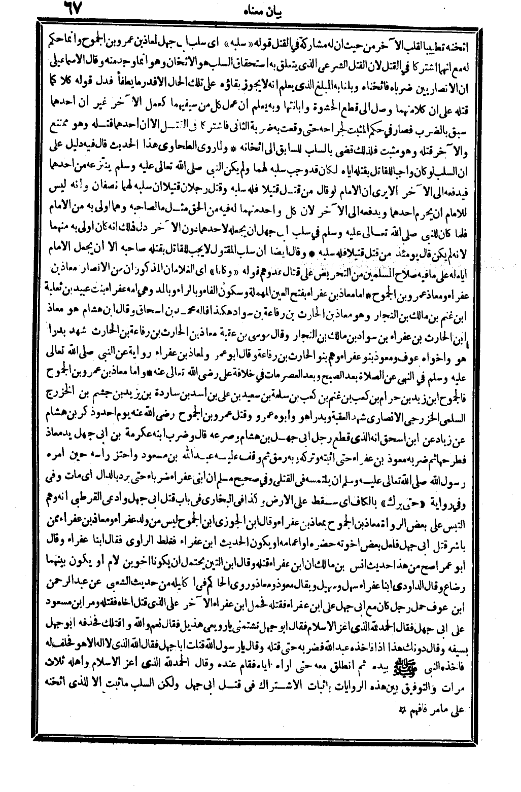 أثخنه تطييباً لقلب الآخر من حَيْثُ إِن لَهُ مُشَاركَة فِي الْقَتْل. قَوْله: (سلبه) أَي: سلب أبي جهل لِمعَاذ بن عَمْرو بن الجموح، وَإِنَّمَا حكم لَهُ مَعَ أَنَّهُمَا اشْتَركَا فِي الْقَتْل لِأَن الْقَتْل الشَّرْعِيّ الَّذِي يتَعَلَّق بِهِ اسْتِحْقَاق السَّلب هُوَ الْإِثْخَان، وَهُوَ إِنَّمَا وجد مِنْهُ، وَقَالَ الْإِسْمَاعِيلِيّ: إِن الأنصاريين ضرباه فأثخناه وبلغا بِهِ الْمبلغ الَّذِي يعلم أَنه لَا يجوز بَقَاؤُهُ على تِلْكَ الْحَال إلاَّ قدر مَا يطفأ، فَدلَّ قَوْله: كلاكما قَتله، على أَن كلاًّ مِنْهُمَا وصل إِلَى قطع الحشوة وإبانتها، وَبِه يعلم أَن عمل كل من سيفيهما كعمل الآخر، غير أَن أَحدهمَا سبق بِالضَّرْبِ فَصَارَ فِي حكم الْمُثبت لجراحه حَتَّى وَقعت بِهِ ضَرْبَة الثَّانِي فاشتركا فِي الْقَتْل، إلاَّ أَن أَحدهمَا قَتله وَهُوَ مُمْتَنع وَالْآخر قَتله وَهُوَ مُثبت، فَلذَلِك قضى بالسلب للسابق إِلَى إثخانه. وَلما روى الطَّحَاوِيّ هَذَا الحَدِيث قَالَ فِيهِ: دَلِيل على أَن السَّلب لَو كَانَ وَاجِبا للْقَاتِل بقتْله إِيَّاه لَكَانَ وَجب سلبه لَهما، وَلم يكن النَّبِي صلى الله عَلَيْهِ وَسلم، ينتزعه من أَحدهمَا فيدفعه إِلَى الآخر إلاَّ يرى أَن الإِمَام لَو قَالَ: من قتل قَتِيلا فَلهُ سلبه، وَقتل رجلَانِ قَتِيلا إِن سلبه لَهما، نِصْفَانِ، وَأَنه لَيْسَ للْإِمَام أَن يحرم أَحدهمَا ويدفعه إِلَى الآخر، لِأَن كل وَاحِد مِنْهُمَا لَهُ فِيهِ من الْحق مثل مَا لصَاحبه، وهما أولى بِهِ من الإِمَام، فَلَمَّا كَانَ للنَّبِي صلى الله عَلَيْهِ وَسلم، فِي سلب أبي جهل أَن يَجعله لأَحَدهمَا دون الآخر دلّ ذَلِك أَنه كَانَ أولى بِهِ مِنْهُمَا، لِأَنَّهُ لم يكن قَالَ يَوْمئِذٍ: من قتل قَتِيلا فَلهُ سلبه. وَقَالَ أَيْضا: إِن سلب الْمَقْتُول لَا يجب للْقَاتِل بقتْله صَاحبه إلاَّ أَن يَجْعَل الإِمَام إِيَّاه لَهُ على مَا فِيهِ صَلَاح الْمُسلمين من التحريض على قتال عدوهم.