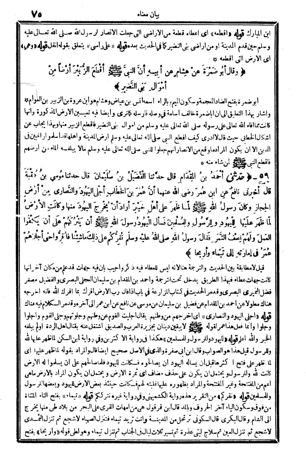 2513 - حدَّثني أحْمَدُ بنُ الْمِقْدَامِ قَالَ حدَّثنا الْفُضَيْلُ بنُ سُلَيْمَانَ قَالَ حدَّثنا مُوسى بنُ عُقْبَةَ قَالَ أخبرَنِي نافِعٌ عنِ ابنِ عُمَرَ رَضِي الله تَعَالَى عنهُما أنَّ عُمَرَ بنَ الخَطَّابِ أجْلَى الْيَهُودَ والنَّصارى مِنْ أرْضِ الحِجَازِ وكانَ رسولُ الله صلى الله عَلَيْهِ وَسلم لَمَّا ظَهرَ على أهْلِ خَيْبَرَ أرادَ أنْ يُخْرِجَ اليَهُودَ مِنها وكانَتِ الأرْضُ لَمَّا ظَهَرَ علَيْهَا لِلْيَهُودَ ولِلْرَّسُولِ ولِلْمُسْلِمِينَ فَسأل الْيَهُودُ رسولَ الله صلى الله عَلَيْهِ وَسلم أَن يَتْرُكَهُمْ علَى أنْ يَكفُوا العَملَ ولَهُمْ نِصْفُ الثَّمَرِ فَقالَ رسولُ الله صلى الله عَلَيْهِ وَسلم نُقِرُّكُمْ على ذَلِكَ مَا شِئْنَا فأُقِرُّوا حَتَّى أجْلاهُمْ عُمَرُ فِي إمارَتِهِ إِلَى تَيْماءَ وأرِيحا. .