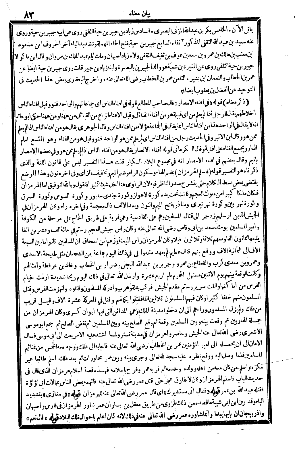ذكر مَعْنَاهُ: قَوْله: (فِي أفناء الْأَمْصَار) ، قَالَ صَاحب (الْمطَالع) : قَوْله، فِي أفناء النَّاس، أَي: جماعاتهم، وَالْوَاحد فنو، وَقيل: أفناء النَّاس أخلاطهم، يُقَال للرجل إِذا لم يعلم من أَي قَبيلَة: هُوَ من أفناء الْقَبَائِل، وَقيل: الأفناء أنزاع من الْقَبَائِل من هَهُنَا وَمن هَهُنَا، حكى أَبُو حَاتِم أَنه لَا يُقَال فِي الْوَاحِد: هَذَا من أفناء النَّاس، إِنَّمَا يُقَال فِي الْجَمَاعَة هَؤُلَاءِ من أفناء النَّاس، وَقَالَ الْجَوْهَرِي: يُقَال: هُوَ من أفناء النَّاس، إِذا لم يعلم مِمَّن هُوَ، وَقَالَ ابْن الْأَثِير: وَفِي الحَدِيث: رجل من أفناء النَّاس أَي: لم يعلم مِمَّن هُوَ، الْوَاحِد فنو، وَقيل: هُوَ من الفناء، وَهُوَ المتسع أَمَام الدَّار، وَيجمع الفناء على أفنية، وَقَالَ الْكرْمَانِي: قَوْله: أفناء الْأَمْصَار، يُقَال: هُوَ من أفناء النَّاس إِذا لم يعلم مِمَّن هُوَ، وَفِي بَعْضهَا: الْأَمْصَار، بِالْمِيم، وَقَالَ بَعضهم (فِي أفناء الْأَمْصَار) : إِنَّه فِي مَجْمُوع الْبِلَاد الْكِبَار. قلت: هَذَا التَّفْسِير لَيْسَ على قانون اللُّغَة، وَالَّذِي ذَكرْنَاهُ هُوَ التَّفْسِير. قَوْله: (فَأسلم الهرمزان) ، بِضَم الْهَاء وَسُكُون الرَّاء وَضم الْمِيم وَتَخْفِيف الزَّاي، وَفِي آخِره نون و: هَذَا الْموضع يَقْتَضِي بعض بسط الْكَلَام حَتَّى ينشرح صدر النَّاظر فِيهِ، لِأَن الرَّاوِي هُنَا أخل شَيْئا كثيرا، فَنَقُول: وَبِاللَّهِ التَّوْفِيق: أما الهرمزان فَكَانَ ملكا كَبِيرا من مُلُوك الْعَجم، وَكَانَت تَحت يَده كورة الأهواز، وكورة جندي سَابُور، وكورة السوس، وكورة السرق، وكورة نهر بَين، وكورة نهر تيري، ومناذر، بِفَتْح الْمِيم وَالنُّون وَبعد الْألف ذال مُعْجمَة وَفِي آخِره رَاء، وَكَانَ الهرمزان فِي الْجَيْش الَّذين أرسلهم يزدجر إِلَى قتال الْمُسلمين وهم على الْقَادِسِيَّة، وَهِي قَرْيَة على طَرِيق الْحَاج على مرحلة من الْكُوفَة، وأمير الْمُسلمين يَوْمئِذٍ سعد بن أبي وَقاص، رَضِي الله تَعَالَى عَنهُ، وَكَانَ رَأس جَيش الْعَجم رستم فِي مائَة ألف وَعشْرين ألفا يتبعهَا ثَمَانُون ألفا، وَمَعَهُمْ ثَلَاثَة وَثَلَاثُونَ فيلاً، وَكَانَ الهرمزان رَأس الميمنة، وَزعم ابْن إِسْحَاق أَن الْمُسلمين كَانُوا مَا بَين السَّبْعَة آلَاف إِلَى الثَّمَانِية آلَاف، وَوَقع بَينهم قتال عَظِيم لم يعْهَد مثله، وأبلى فِي ذَلِك الْيَوْم جمَاعَة من الشجعان مثل طليحة الْأَسدي وَعَمْرو بن معدي كرب والقعقاع بن عَمْرو وَجَرِير بن عبد الله البَجلِيّ وَضِرَار بن الْخطاب وخَالِد بن عرفطة وأمثالهم، وَكَانَت الْوَقْعَة بَينهم يَوْم الِاثْنَيْنِ مستهل الْمحرم عَام أَربع عشرَة، وَأرْسل الله تَعَالَى فِي ذَلِك الْيَوْم ريحًا شَدِيدَة أرمت خيام الْفرس من أماكنها، وَأَلْقَتْ سَرِير رستم مقدم الْجَيْش، فَركب بغلة وهرب، وأدركه الْمُسلمُونَ وقتلوه، وانهزمت الْفرس وَقتل الْمُسلمُونَ مِنْهُم خلقا كثيرا، وَكَانَ فيهم المسلسلون ثَلَاثِينَ ألف فَقتلُوا بكمالهم، وَقتل فِي المعركة عشرَة آلَاف، وَقيل: قريب من ذَلِك، وَلم يزل الْمُسلمُونَ وَرَاءَهُمْ إِلَى أَن دخلُوا مَدِينَة الْملك، وَهِي الْمَدَائِن الَّتِي فِيهَا إيوَان كسْرَى، وَكَانَ الهرمزان من جملَة الهاربين، ثمَّ وَقعت بَينه وَبَين الْمُسلمين وقْعَة، ثمَّ وَقع الصُّلْح بَينه وَبَين الْمُسلمين، ثمَّ نقض الصُّلْح ثمَّ: جمع أَبُو مُوسَى الْأَشْعَرِيّ، رَضِي الله تَعَالَى عَنهُ، الْجَيْش وحاصروا هرمزان فِي مَدِينَة تستر، وَلما اشْتَدَّ عَلَيْهِ الْأَمر بعث إِلَى أبي مُوسَى فَسَأَلَ الْأمان إِلَى أَن يحملهُ إِلَى أَمِير الْمُؤمنِينَ عمر بن الْخطاب، رَضِي الله تَعَالَى عَنهُ، فَأَجَابَهُ إِلَى ذَلِك وَوجه مَعَه الْخمس من غَنَائِم الْمُسلمين، فَلَمَّا وصل إِلَيْهِ وَوَقع نظره عَلَيْهِ سجد لله تَع