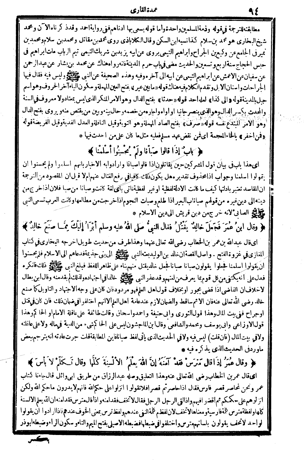 أَي: قَالَ عبد الله بن عمر بن الْخطاب، رَضِي الله تَعَالَى عَنْهُمَا. . وَهَذَا طرف من حَدِيث طَوِيل أخرجه البُخَارِيّ فِي كتاب الْمَغَازِي فِي غَزْوَة الْفَتْح. وأصل الْقِصَّة أَن خَالِد بن الْوَلِيد بَعثه النَّبِي صلى الله عَلَيْهِ وَسلم إِلَى بني جذيمة فَدَعَاهُمْ إِلَى الْإِسْلَام فَلم يحسنوا أَن يَقُولُوا: أسلمنَا، فَجعلُوا يَقُولُونَ: صبأنا، صبأنا، فَجعل خَالِد يقتل مِنْهُم بِنَاء على ظَاهر اللَّفْظ، فَبلغ النَّبِي صلى الله عَلَيْهِ وَسلم ذَلِك فَأنكرهُ، فَدلَّ على أَنه يَكْتَفِي من كل قوم بِمَا يعرف من لغتهم، وَقد عذر النَّبِي صلى الله عَلَيْهِ وَسلم خَالِدا فِي اجْتِهَاده، وَلذَلِك لم يقدْ مِنْهُ. وَقَالَ ابْن بطال: لَا خلاف أَن القَاضِي إِذا قضى بجور أَو بِخِلَاف قَول أهل الْعلم فَهُوَ مَرْدُود، فَإِن كَانَ على وَجه الِاجْتِهَاد والتأويل كَمَا صنع خَالِد، رَضِي الله تَعَالَى عَنهُ، فَإِن الْإِثْم سَاقِط وَالضَّمان لَازم عِنْد عَامَّة أهل الْعلم، إلاَّ أَنهم اخْتلفُوا فِي ضَمَان ذَلِك، فَإِن كَانَ فِي قتل أَو جراح فَفِي بَيت المَال، وَهَذَا قَول الثَّوْريّ وَأبي حنيفَة وَأحمد وَإِسْحَاق. وَقَالَت طَائِفَة: على عَاقِلَة الإِمَام أَو الْحَاكِم، وَهَذَا قَول الْأَوْزَاعِيّ وَأبي يُوسُف وَمُحَمّد وَالشَّافِعِيّ، وَقَالَ ابْن الْمَاجشون: لَيْسَ على الْحَاكِم شَيْء من الدِّيَة فِي مَاله وَلَا على عَاقِلَته وَلَا فِي بَيت المَال. فَإِن قلت: لَيْسَ فِيهِ وَلَا فِي الحَدِيث الَّذِي يَأْتِي لفظ: صبأنا، فَأَيْنَ الْمُطَابقَة؟ قلت: جرت عَادَته أَنه يترجم بِبَعْض مَا ورد فِي الحَدِيث الَّذِي يذكرهُ فِيهِ.
