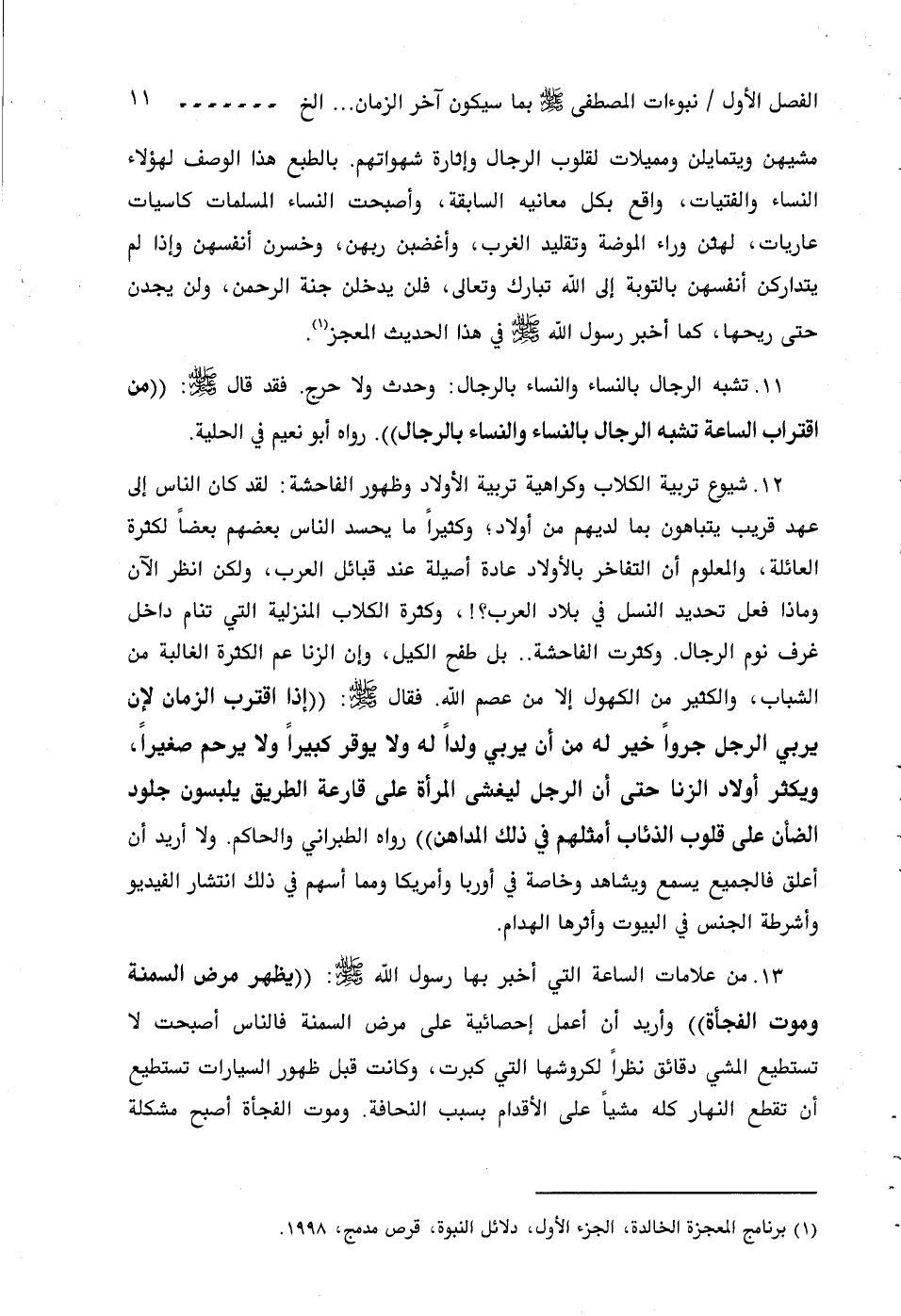 13. من علامات الساعة التي أخبر بها رسول اللّه صلى اللّه عليه وسلم: ((يظهر مرض السمنة وموت الفجأة)) وأريد أن أعمل إحصائية على مرض السمنة فالناس أصبحت لا تستطيع المشي دقائق نظرا لكروشها التي كبرت، وكانت قبل ظهور السيارات تستطيع أن تقطع النهار كله مشيا على الأقدام بسبب النحافة. وموت الفجأة أصبح مشكلة