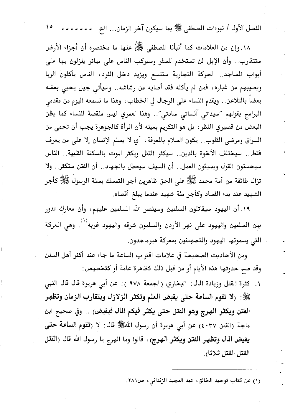 18. وإن من العلامات كما أنبأنا المصطفى صلى اللّه عليه وسلم عنها ما مختصره أن أجزاء الأرض ستتقارب .. وأن الإبل لن تستخدم للسفر وسيركب الناس على مياثر ينزلون بها على أبواب المساجد .. الحركة التجارية ستتسع ويزيد دخل الفرد، الناس يأكلون الربا ويصيبهم من غباره، فمن لم يأكله فقد أصابه من رشاشه .. وسيأتي جيل يحيي بعضه بعضا بالتلاعن .. ويقدم النساء على الرجال في الخطاب، وهذا ما نسمعه اليوم من مقدمي البرامج بقولهم سيداتي آنساتي سادتي .. وهذا لعمري ليس منقصة للنساء كما يظن البعض من قصيري النظر، بل هو التكريم بعينه لأن المرأة كالجوهرة يجب أن تحمى من السراق ومرضى القلوب .. يكون السلام بالمعرفة، أي لا يسلم الإنسان إلا على من يعرف فقط ... سيختلف الأخوة بالدين .. سيكثر القتل ويكثر الموت بالسكتة القلبية .. الناس سيحسنون القول ويسيئون العمل .. أن السيف سيعطل بالجهاد .. أن الفتن ستكثر .. ولا تزال طائفة من أمة محمد صلى اللّه عليه وسلم على الحق ظاهرين أجر المتمسك بسنة الرسول صلى اللّه عليه وسلم كأجر الشهيد عند بدء الفساد وكأجر مائة شهيد عند ما يبلغ أقصاه.