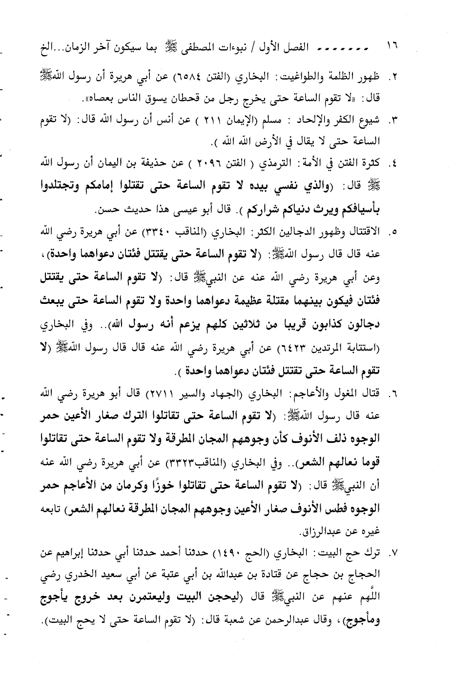 6. قتال المغول والأعاجم: البخاري (الجهاد والسير 2711) قال أبو هريرة رضي اللّه عنه قال رسول اللّه صلى اللّه عليه وسلم: (لا تقوم الساعة حتى تقاتلوا الترك صغار الأعين حمر الوجوه ذلف الأنوف كأن وجوههم المجان المطرقة ولا تقوم الساعة حتى تقاتلوا قوما نعالهم الشعر) .. وفي البخاري (المناقب 3323) عن أبي هريرة رضي اللّه عنه أن النبي صلى اللّه عليه وسلم قال: (لا تقوم الساعة حتى تقاتلوا خوزا وكرمان من الأعاجم حمر الوجوه فطس الأنوف صغار الأعين وجوههم المجان المطرقة نعالهم الشعر) تابعه غيره عن عبد الرزاق.