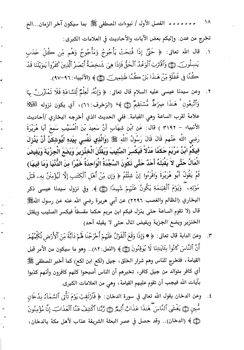 2. وعن سيدنا عيسى عليه السلام قال تعالى: وإِنَّهُ لَعِلْمٌ لِلسَّاعَةِ فَلا تَمْتَرُنَّ بِها واتَّبِعُونِ هذا صِراطٌ مُسْتَقِيمٌ (61)، (الزخرف: 61)، أي يكون نزوله عليه السلام علامة لقرب الساعة وهي القيامة. ففي الحديث الذي أخرجه البخاري/ أحاديث الأنبياء - 3192) قال: عن ابن شهاب أنّ سعيد بن المسيّب سمع أبا هريرة رضي اللّه عنهم قال قال رسول اللّه صلى اللّه عليه وسلم (والّذي نفسي بيده ليوشكنّ أن ينزل فيكم ابن مريم حكما عدلا فيكسر الصّليب ويقتل الخنزير ويضع الجزية ويفيض المال حتّى لا يقبله أحد حتّى تكون السّجدة الواحدة خيرا من الدّنيا وما فيها) ثمّ يقول أبو هريرة واقرءوا إن شئتم وإِنْ مِنْ أَهْلِ الْكِتابِ إِلَّا لَيُؤْمِنَنَّ بِهِ قَبْلَ مَوْتِهِ ويَوْمَ الْقِيامَةِ يَكُونُ عَلَيْهِمْ شَهِيداً (159). وفي نزول سيدنا عيسى ذكر البخاري (المظالم والغصب 2296) عن أبي هريرة رضي اللّه عنه عن رسول اللّه صلى اللّه عليه وسلم قال (لا تقوم الساعة حتى ينزل فيكم ابن مريم حكما مقسطا فيكسر الصليب ويقتل الخنزير ويضع الجزية ويفيض المال حتى لا يقبله أحد) 3. وعن الدابة قال تعالى: وإِذا وَقَعَ الْقَوْلُ عَلَيْهِمْ أَخْرَجْنا لَهُمْ دَابَّةً مِنَ الْأَرْضِ تُكَلِّمُهُمْ أَنَّ النَّاسَ كانُوا بِآياتِنا لا يُوقِنُونَ (82) (النمل: 82) .. وهو ما سيكون من الأمر قبل القيامة، فتخرج للناس وهم شرار الخلق، جيل (لكع ابن لكع) كما أخبر المصطفى صلى اللّه عليه وسلم أي كافر متوالد من جيل كافر، تخبرهم أن الناس أصبحوا كلهم كافرون وأنهم كذبوا بآيات اللّه فيجب أن تقوم عليهم القيامة، وهي من العلامات الكبرى.