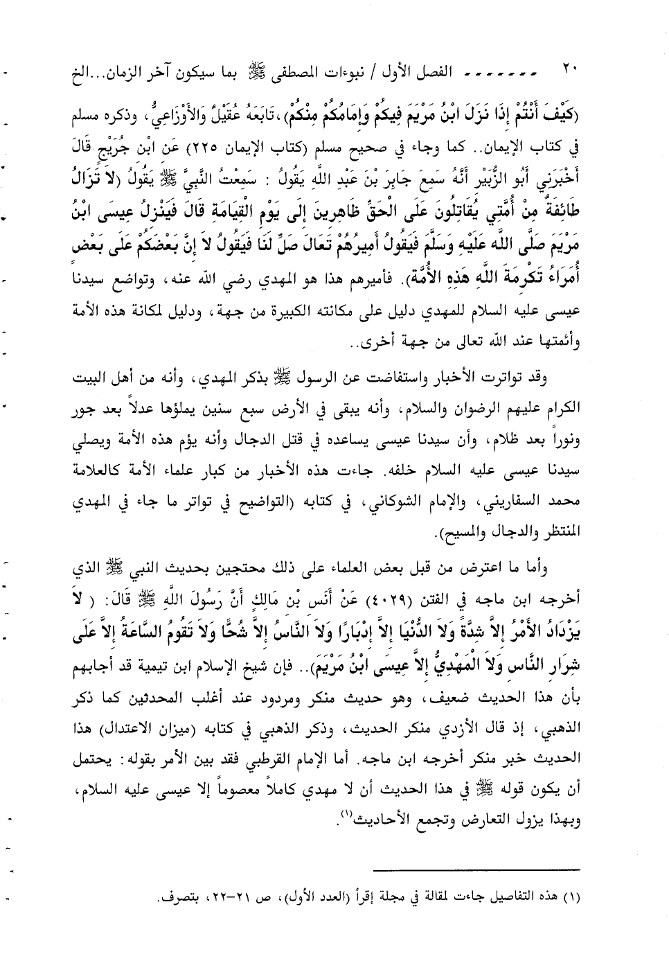 (كيف أنتم إذا نزل ابن مريم فيكم وإمامكم منكم)، تابعه عقيل والأوزاعيّ، وذكره مسلم في كتاب الإيمان .. كما وجاء في صحيح مسلم (كتاب الإيمان 225) عن ابن جريج قال أخبرني أبو الزّبير أنّه سمع جابر بن عبد اللّه يقول: سمعت النّبيّ صلى اللّه عليه وسلم يقول (لا تزال طائفة من أمّتي يقاتلون على الحقّ ظاهرين إلى يوم القيامة قال فينزل عيسى ابن مريم صلّى اللّه عليه وسلّم فيقول أميرهم تعال صلّ لنا فيقول لا إنّ بعضكم على بعض أمراء تكرمة اللّه هذه الأمّة). فأميرهم هذا هو المهدي رضي اللّه عنه، وتواضع سيدنا عيسى عليه السلام للمهدي دليل على مكانته الكبيرة من جهة، ودليل لمكانة هذه الأمة وأئمتها عند اللّه تعالى من جهة أخرى ..