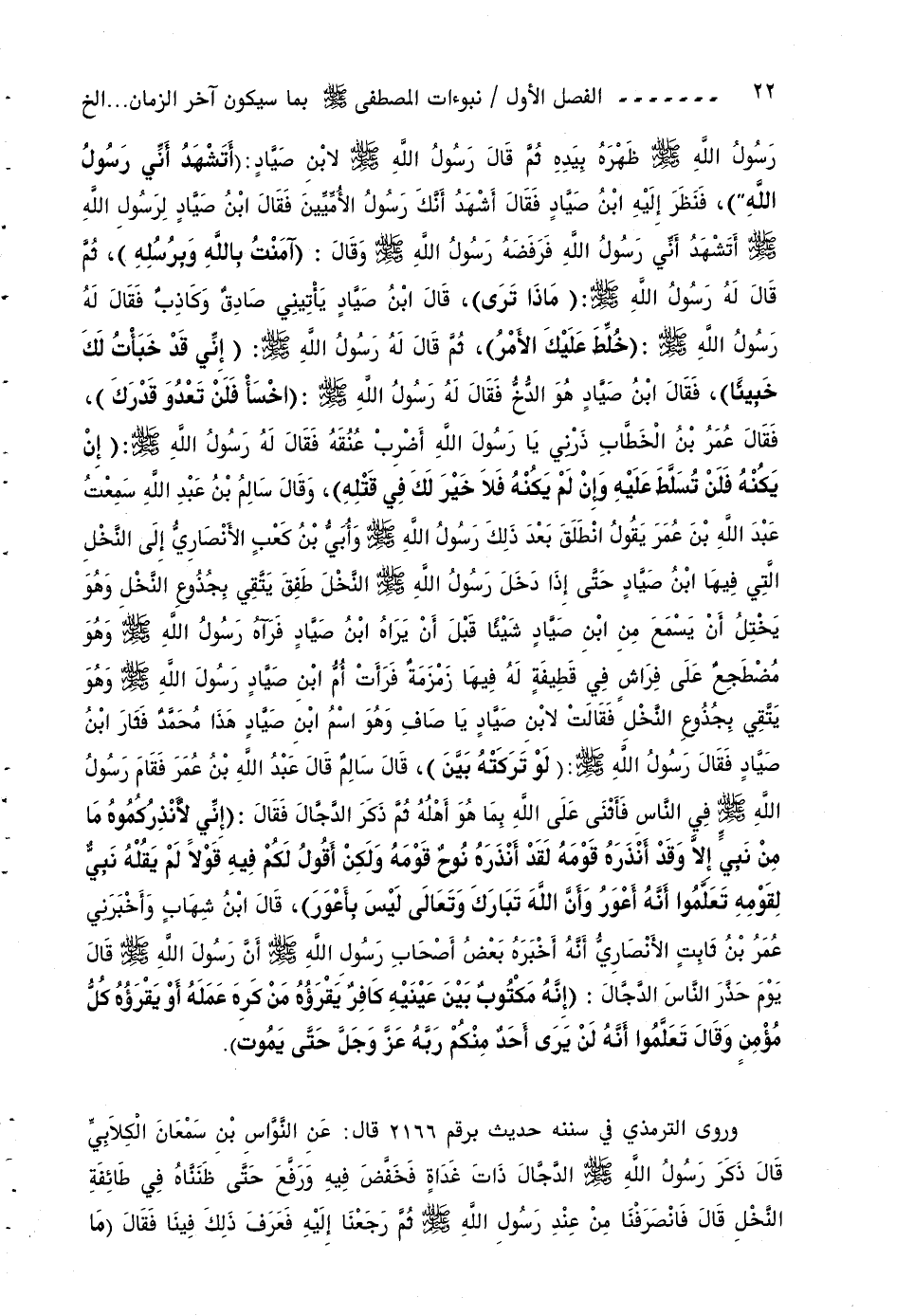 رسول اللّه صلى اللّه عليه وسلم ظهره بيده ثمّ قال رسول اللّه صلى اللّه عليه وسلم لابن صيّاد: (أتشهد أنّي رسول اللّه)، فنظر إليه ابن صيّاد فقال أشهد أنّك رسول الأمّيّين فقال ابن صيّاد لرسول اللّه صلى اللّه عليه وسلم أتشهد أنّي رسول اللّه فرفضه رسول اللّه صلى اللّه عليه وسلم وقال: (آمنت باللّه وبرسله)، ثمّ قال له رسول اللّه صلى اللّه عليه وسلم: (ما ذا ترى)، قال ابن صيّاد يأتيني صادق وكاذب فقال له رسول اللّه صلى اللّه عليه وسلم: (خلّط عليك الأمر)، ثمّ قال له رسول اللّه صلى اللّه عليه وسلم: (إنّي قد خبأت لك خبيئا)، فقال ابن صيّاد هو الدّخّ فقال له رسول اللّه صلى اللّه عليه وسلم: (اخسأ فلن تعدو قدرك)، فقال عمر بن الخطّاب ذرني يا رسول اللّه أضرب عنقه فقال له رسول اللّه صلى اللّه عليه وسلم: (إن يكنه فلن تسلّط عليه وإن لم يكنه فلا خير لك في قتله)، وقال سالم بن عبد اللّه سمعت عبد اللّه بن عمر يقول انطلق بعد ذلك رسول اللّه صلى اللّه عليه وسلم وأبيّ بن كعب الأنصاريّ إلى النّخل الّتي فيها ابن صيّاد حتّى إذا دخل رسول اللّه صلى اللّه عليه وسلم النّخل طفق يتّقي بجذوع النّخل وهو يختل أن يسمع من ابن صيّاد شيئا قبل أن يراه ابن صيّاد فرآه رسول اللّه صلى اللّه عليه وسلم وهو مضطجع على فراش في قطيفة له فيها زمزمة فرأت أمّ ابن صيّاد رسول اللّه صلى اللّه عليه وسلم وهو يتّقي بجذوع النّخل فقالت لابن صيّاد يا صاف وهو اسم ابن صيّاد هذا محمّد فثار ابن صيّاد فقال رسول اللّه صلى اللّه عليه وسلم: (لو تركته بيّن)، قال سالم قال عبد اللّه بن عمر فقام رسول اللّه صلى اللّه عليه وسلم في النّاس فأثنى على اللّه بما هو أهله ثمّ ذكر الدّجّال فقال: (إنّي لأنذركموه ما من نبيّ إلّا وقد أنذره قومه لقد أنذره نوح قومه ولكن أقول لكم فيه قولا لم يقله نبيّ لقومه تعلّموا أنّه أعور وأنّ اللّه تبارك وتعالى ليس بأعور)، قال ابن شهاب وأخبرني عمر بن ثابت الأنصاريّ أنّه أخبره بعض أصحاب رسول اللّه صلى اللّه عليه وسلم أنّ رسول اللّه صلى اللّه عليه وسلم قال يوم حذّر النّاس الدّجّال: (إنّه مكتوب بين عينيه كافر يقرؤه من كره عمله أو يقرؤه كلّ مؤمن وقال تعلّموا أنّه لن يرى أحد منكم ربّه عزّ وجلّ حتّى يموت).