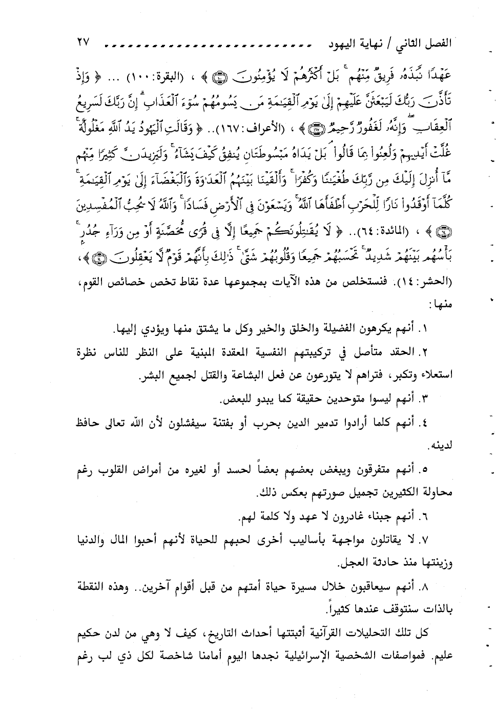 عَهْداً نَبَذَهُ فَرِيقٌ مِنْهُمْ بَلْ أَكْثَرُهُمْ لا يُؤْمِنُونَ (100)، (البقرة: 100) ... وإِذْ تَأَذَّنَ رَبُّكَ لَيَبْعَثَنَّ عَلَيْهِمْ إِلى يَوْمِ الْقِيامَةِ مَنْ يَسُومُهُمْ سُوءَ الْعَذابِ إِنَّ رَبَّكَ لَسَرِيعُ الْعِقابِ وإِنَّهُ لَغَفُورٌ رَحِيمٌ (167)، (الأعراف: 167) .. وقالَتِ الْيَهُودُ يَدُ اللَّهِ مَغْلُولَةٌ غُلَّتْ أَيْدِيهِمْ ولُعِنُوا بِما قالُوا بَلْ يَداهُ مَبْسُوطَتانِ يُنْفِقُ كَيْفَ يَشاءُ ولَيَزِيدَنَّ كَثِيراً مِنْهُمْ ما أُنْزِلَ إِلَيْكَ مِنْ رَبِّكَ طُغْياناً وكُفْراً وأَلْقَيْنا بَيْنَهُمُ الْعَداوَةَ والْبَغْضاءَ إِلى يَوْمِ الْقِيامَةِ كُلَّما أَوْقَدُوا ناراً لِلْحَرْبِ أَطْفَأَهَا اللَّهُ ويَسْعَوْنَ فِي الْأَرْضِ فَساداً واللَّهُ لا يُحِبُّ الْمُفْسِدِينَ (64)، (المائدة: 64) .. لا يُقاتِلُونَكُمْ جَمِيعاً إِلَّا فِي قُرىً مُحَصَّنَةٍ أَوْ مِنْ وَراءِ جُدُرٍ بَاسُهُمْ بَيْنَهُمْ شَدِيدٌ تَحْسَبُهُمْ جَمِيعاً وقُلُوبُهُمْ شَتَّى ذلِكَ بِأَنَّهُمْ قَوْمٌ لا يَعْقِلُونَ (14)، (الحشر: 14). فنستخلص من هذه الآيات بمجموعها عدة نقاط تخص خصائص القوم، منها:
