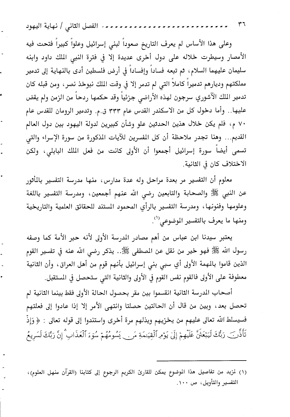 معلوم أن التفسير مر بعدة مراحل وله عدة مدارس، منها مدرسة التفسير بالمأثور عن النبي صلى اللّه عليه وسلم والصحابة والتابعين رضي اللّه عنهم أجمعين، ومدرسة التفسير باللغة وعلومها وفنونها، ومدرسة التفسير بالرأي المحمود المستند للحقائق العلمية والتاريخية ومنها ما يعرف بالتفسير الموضوعي. «1» يعتبر سيدنا ابن عباس من أهم مصادر المدرسة الأولى لأنه حبر الأمة كما وصفه رسول اللّه صلى اللّه عليه وسلم فهو خير من نقل عن المصطفى صلى اللّه عليه وسلم .. يذكر رضي اللّه عنه في تفسير القوم الذين قاموا بالمهمة الأولى أي سبي بني إسرائيل بأنهم قوم من أهل العراق، وأن الثانية معطوفة على الأولى فالقوم نفس القوم في الأولى والثانية التي ستحصل في المستقبل.