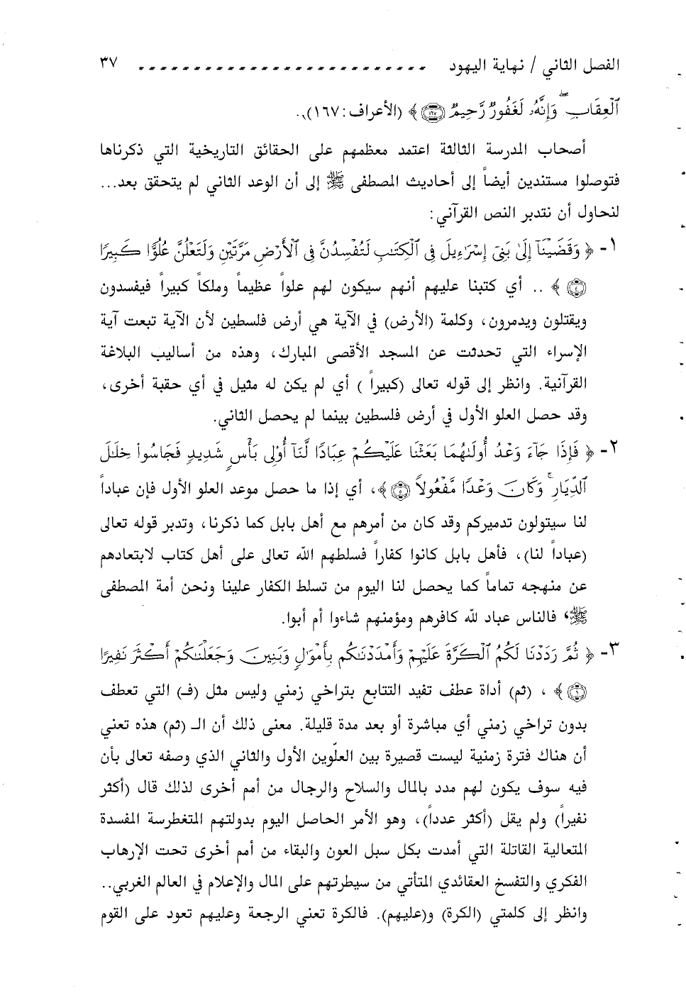 3 - ثُمَّ رَدَدْنا لَكُمُ الْكَرَّةَ عَلَيْهِمْ وأَمْدَدْناكُمْ بِأَمْوالٍ وبَنِينَ وجَعَلْناكُمْ أَكْثَرَ نَفِيراً (6)، (ثم) أداة عطف تفيد التتابع بتراخي زمني وليس مثل (ف) التي تعطف بدون تراخي زمني أي مباشرة أو بعد مدة قليلة. معنى ذلك أن ال (ثم) هذه تعني أن هناك فترة زمنية ليست قصيرة بين العلوين الأول والثاني الذي وصفه تعالى بأن فيه سوف يكون لهم مدد بالمال والسلاح والرجال من أمم أخرى لذلك قال (أَكْثَرَ نَفِيراً) ولم يقل (أكثر عددا)، وهو الأمر الحاصل اليوم بدولتهم المتغطرسة المفسدة المتعالية القاتلة التي أمدت بكل سبل العون والبقاء من أمم أخرى تحت الإرهاب الفكري والتفسخ العقائدي المتأتي من سيطرتهم على المال والإعلام في العالم الغربي ..