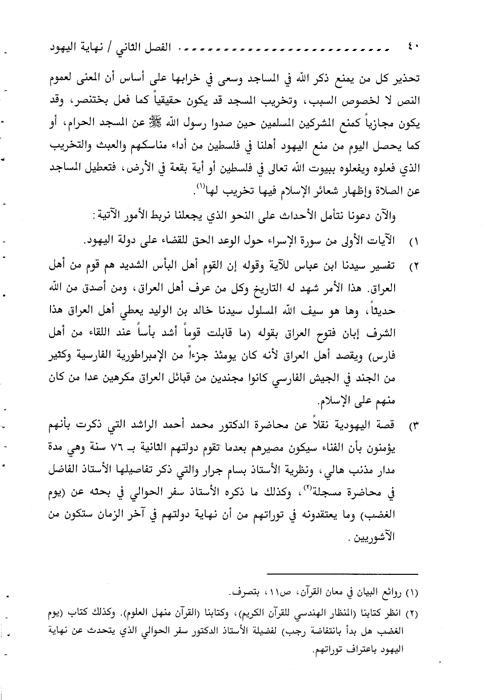 (2) انظر كتابنا (المنظار الهندسي للقرآن الكريم)، وكتابنا (القرآن منهل العلوم). وكذلك كتاب (يوم الغضب هل بدأ بانتفاضة رجب) لفضيلة الأستاذ الدكتور سفر الحوالي الذي يتحدث عن نهاية اليهود باعتراف توراتهم.