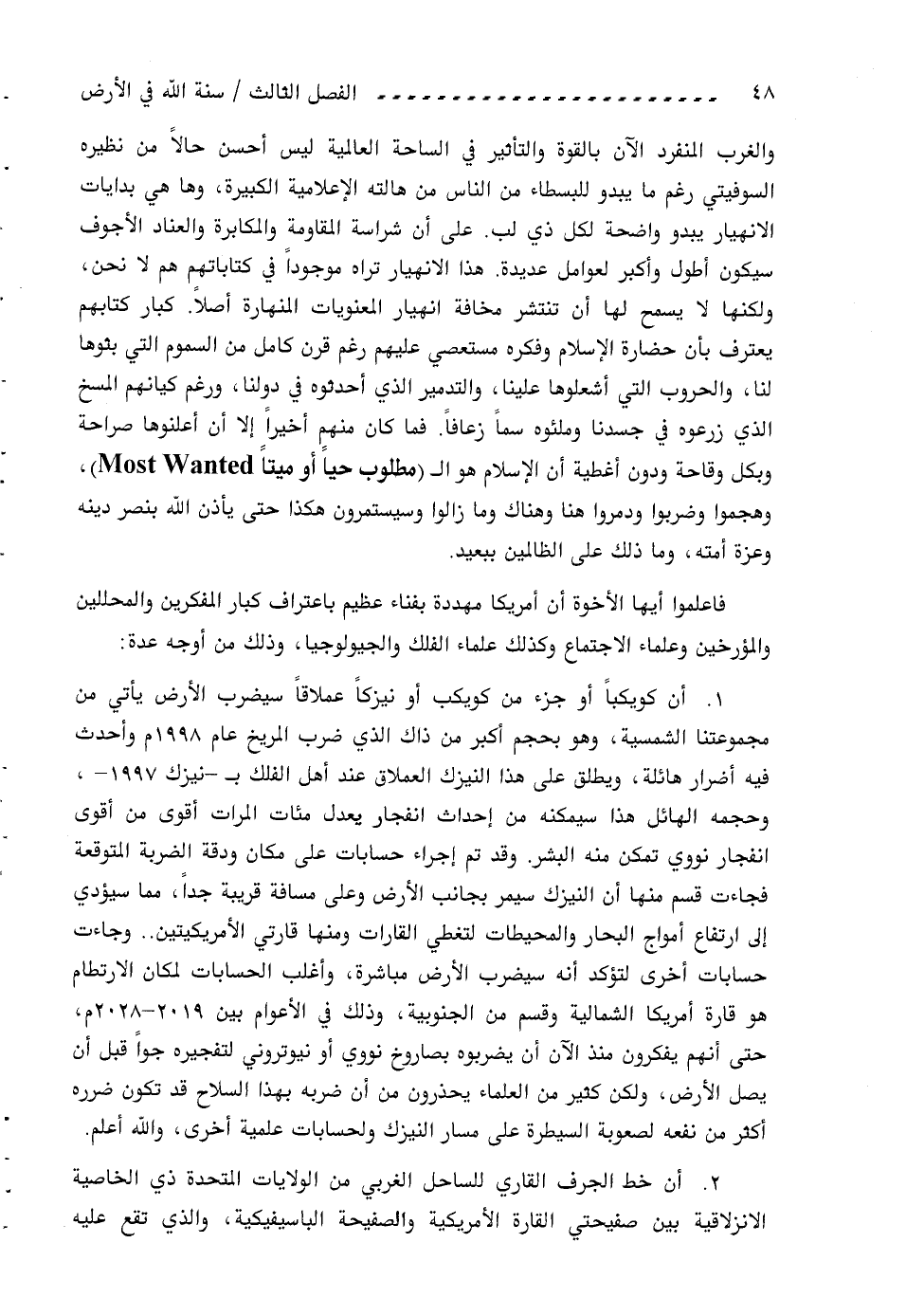 فاعلموا أيها الأخوة أن أمريكا مهددة بفناء عظيم باعتراف كبار المفكرين والمحللين والمؤرخين وعلماء الاجتماع وكذلك علماء الفلك والجيولوجيا، وذلك من أوجه عدة: