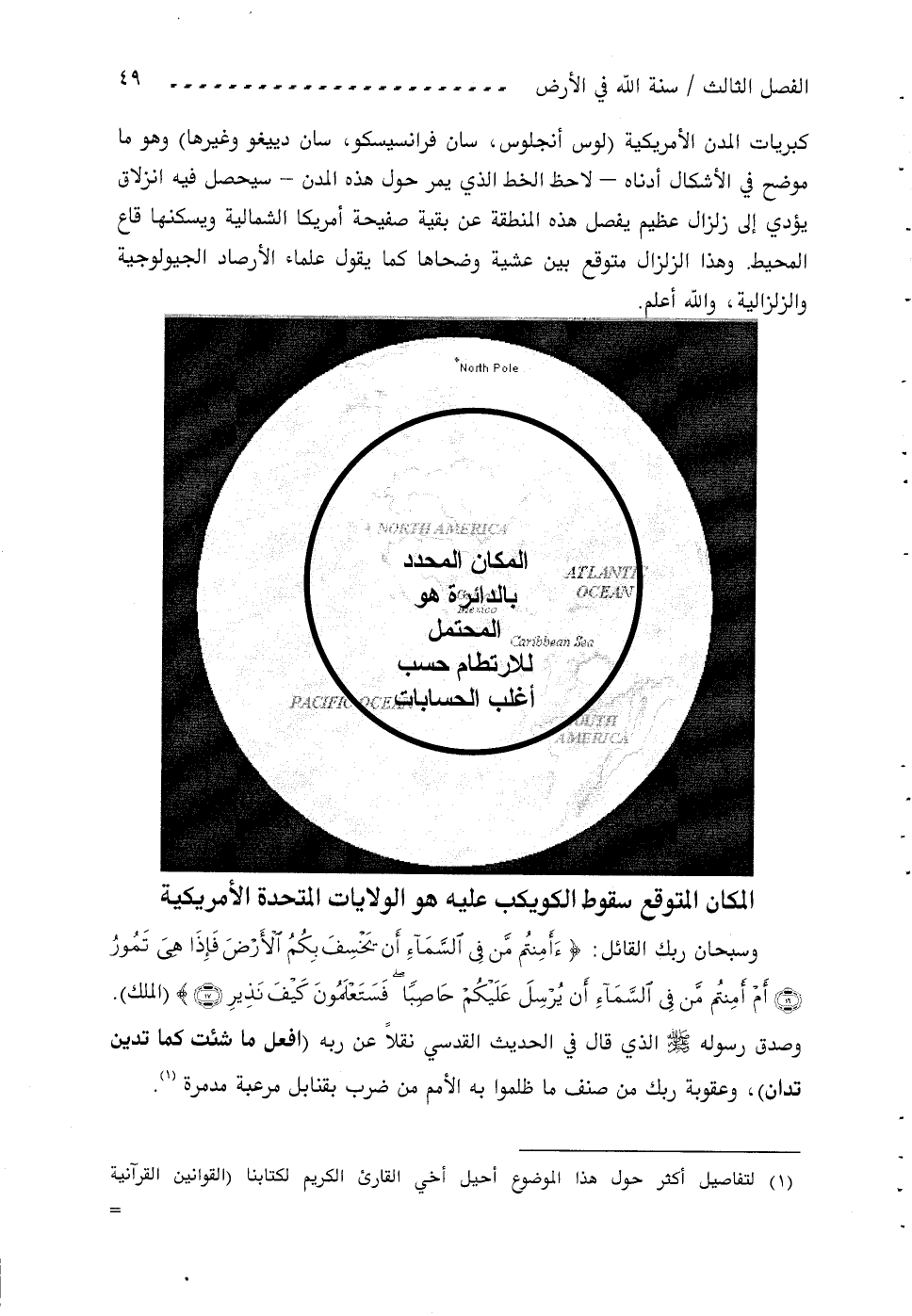 كبريات المدن الأمريكية (لوس أنجلوس، سان فرانسيسكو، سان دييغو وغيرها) وهو ما موضح في الأشكال أدناه - لاحظ الخط الذي يمر حول هذه المدن - سيحصل فيه انزلاق يؤدي إلى زلزال عظيم يفصل هذه المنطقة عن بقية صفيحة أمريكا الشمالية ويسكنها قاع المحيط. وهذا الزلزال متوقع بين عشية وضحاها كما يقول علماء الأرصاد الجيولوجية والزلزالية، واللّه أعلم.