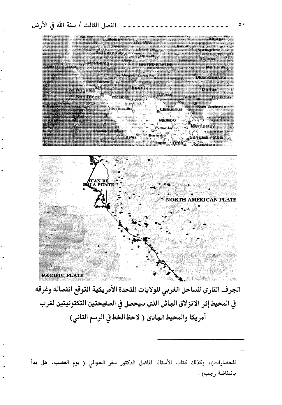الجرف القاري للساحل الغربي للولايات المتحدة الأمريكية المتوقع انفصاله وغرقه في المحيط إثر الانزلاق الهائل الذي سيحصل في الصفيحتين التكتونيتين لغرب أمريكا والمحيط الهادئ (لاحظ الخط في الرسم الثاني)
