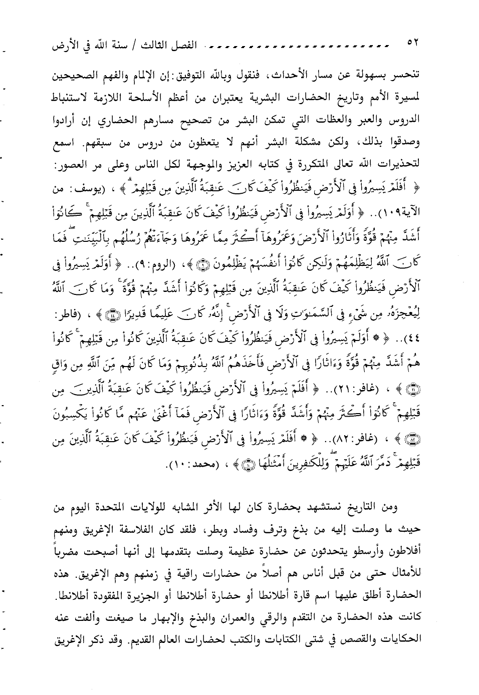 أَفَلَمْ يَسِيرُوا فِي الْأَرْضِ فَيَنْظُرُوا كَيْفَ كانَ عاقِبَةُ الَّذِينَ مِنْ قَبْلِهِمْ، (يوسف: من الآية 109) .. أَولَمْ يَسِيرُوا فِي الْأَرْضِ فَيَنْظُرُوا كَيْفَ كانَ عاقِبَةُ الَّذِينَ مِنْ قَبْلِهِمْ كانُوا أَشَدَّ مِنْهُمْ قُوَّةً وأَثارُوا الْأَرْضَ وعَمَرُوها أَكْثَرَ مِمَّا عَمَرُوها وجاءَتْهُمْ رُسُلُهُمْ بِالْبَيِّناتِ فَما كانَ اللَّهُ لِيَظْلِمَهُمْ ولكِنْ كانُوا أَنْفُسَهُمْ يَظْلِمُونَ (9)، (الروم: 9) .. أَولَمْ يَسِيرُوا فِي الْأَرْضِ فَيَنْظُرُوا كَيْفَ كانَ عاقِبَةُ الَّذِينَ مِنْ قَبْلِهِمْ وكانُوا أَشَدَّ مِنْهُمْ قُوَّةً وما كانَ اللَّهُ لِيُعْجِزَهُ مِنْ شَيْءٍ فِي السَّماواتِ ولا فِي الْأَرْضِ إِنَّهُ كانَ عَلِيماً قَدِيراً (44)، (فاطر: