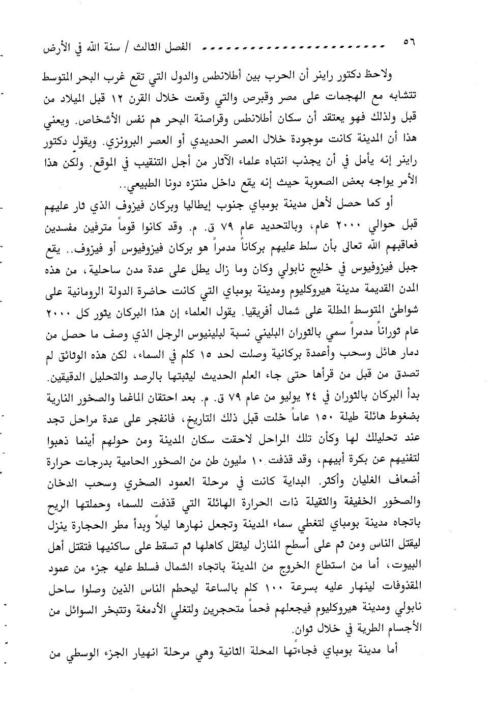 أو كما حصل لأهل مدينة بومباي جنوب إيطاليا وبركان فيزوف الذي ثار عليهم قبل حوالي 2000 عام، وبالتحديد عام 79 ق. م. وقد كانوا قوما مترفين مفسدين فعاقبهم اللّه تعالى بأن سلط عليهم بركانا مدمرا هو بركان فيزوفيوس أو فيزوف .. يقع جبل فيزوفيوس في خليج نابولي وكان وما زال يطل على عدة مدن ساحلية، من هذه المدن القديمة مدينة هيروكليوم ومدينة بومباي التي كانت حاضرة الدولة الرومانية على شواطئ المتوسط المطلة على شمال إفريقيا. يقول العلماء إن هذا البركان يثور كل 2000 عام ثورانا مدمرا سمي بالثوران البليني نسبة لبلينيوس الرجل الذي وصف ما حصل من دمار هائل وسحب وأعمدة بركانية وصلت لحد 15 كلم في السماء، لكن هذه الوثائق لم تصدق من قبل من قرأها حتى جاء العلم الحديث ليثبتها بالرصد والتحليل الدقيقين.