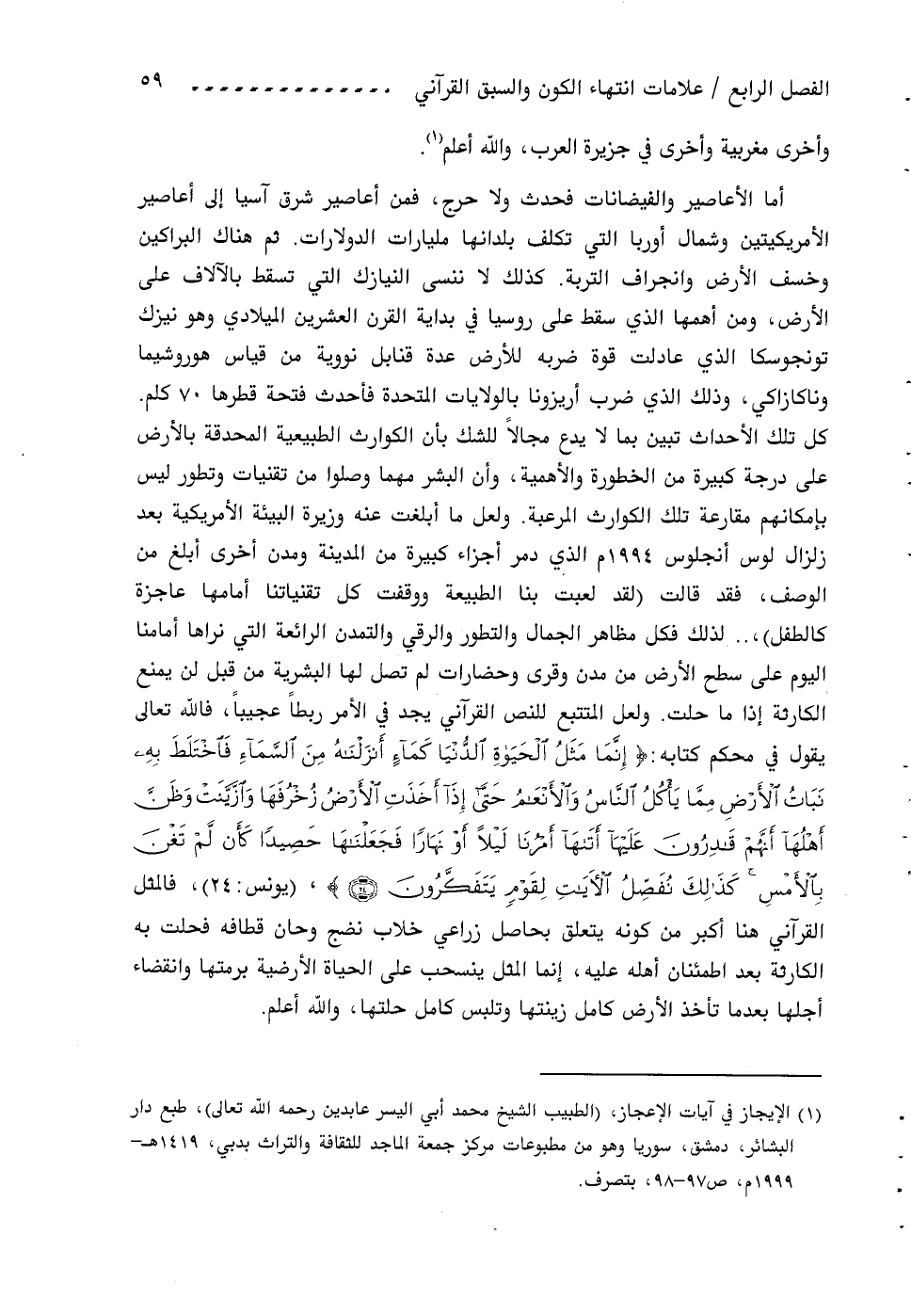 كل تلك الأحداث تبين بما لا يدع مجالا للشك بأن الكوارث الطبيعية المحدقة بالأرض على درجة كبيرة من الخطورة والأهمية، وأن البشر مهما وصلوا من تقنيات وتطور ليس بإمكانهم مقارعة تلك الكوارث المرعبة. ولعل ما أبلغت عنه وزيرة البيئة الأمريكية بعد زلزال لوس أنجلوس 1994 م الذي دمر أجزاء كبيرة من المدينة ومدن أخرى أبلغ من الوصف، فقد قالت (لقد لعبت بنا الطبيعة ووقفت كل تقنياتنا أمامها عاجزة كالطفل)، .. لذلك فكل مظاهر الجمال والتطور والرقي والتمدن الرائعة التي نراها أمامنا اليوم على سطح الأرض من مدن وقرى وحضارات لم تصل لها البشرية من قبل لن يمنع الكارثة إذا ما حلت. ولعل المتتبع للنص القرآني يجد في الأمر ربطا عجيبا، فاللّه تعالى يقول في محكم كتابه: إِنَّما مَثَلُ الْحَياةِ الدُّنْيا كَماءٍ أَنْزَلْناهُ مِنَ السَّماءِ فَاخْتَلَطَ بِهِ نَباتُ الْأَرْضِ مِمَّا يَاكُلُ النَّاسُ والْأَنْعامُ حَتَّى إِذا أَخَذَتِ الْأَرْضُ زُخْرُفَها وازَّيَّنَتْ وظَنَّ أَهْلُها أَنَّهُمْ قادِرُونَ عَلَيْها أَتاها أَمْرُنا لَيْلًا أَوْ نَهاراً فَجَعَلْناها حَصِيداً كَأَنْ لَمْ تَغْنَ بِالْأَمْسِ كَذلِكَ نُفَصِّلُ الْآياتِ لِقَوْمٍ يَتَفَكَّرُونَ (24)، (يونس: 24)، فالمثل القرآني هنا أكبر من كونه يتعلق بحاصل زراعي خلاب نضج وحان قطافه فحلت به الكارثة بعد اطمئنان أهله عليه، إنما المثل ينسحب على الحياة الأرضية برمتها وانقضاء أجلها بعد ما تأخذ الأرض كامل زينتها وتلبس كامل حلتها، واللّه أعلم.