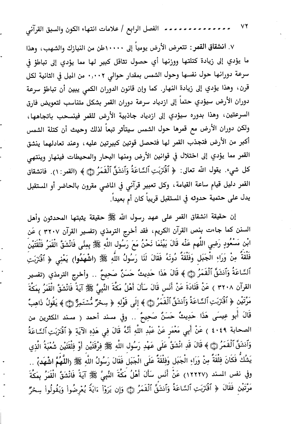 إن حقيقة انشقاق القمر على عهد رسول اللّه صلى اللّه عليه وسلم حقيقة يثبتها المحدثون وأهل السنن كما جاءت بنص القرآن الكريم، فقد أخرج الترمذي (تفسير القرآن 3207) عن ابن مسعود رضي اللّهم عنه قال بينما نحن مع رسول اللّه صلى اللّه عليه وسلم بمنى فانشقّ القمر فلقتين فلقة من وراء الجبل وفلقة دونه فقال لنا رسول اللّه صلى اللّه عليه وسلم (اشهدوا) يعني اقْتَرَبَتِ السَّاعَةُ وانْشَقَّ الْقَمَرُ (1) قال هذا حديث حسن صحيح .. وأخرج الترمذي (تفسير القرآن 3208) عن قتادة عن أنس قال سأل أهل مكّة النّبيّ صلى اللّه عليه وسلم آية فانشقّ القمر بمكّة مرّتين اقْتَرَبَتِ السَّاعَةُ وانْشَقَّ الْقَمَرُ (1) إلى قوله سِحْرٌ مُسْتَمِرٌّ (2) يقول ذاهب قال أبو عيسى هذا حديث حسن صحيح .. وفي مسند أحمد (مسند المكثرين من الصحابة 4049) عن أبي معمر عن عبد اللّه أنّه قال في هذه الآية اقْتَرَبَتِ السَّاعَةُ وانْشَقَّ الْقَمَرُ (1) قال قد انشقّ على عهد رسول اللّه صلى اللّه عليه وسلم فرقتين أو فلقتين شعبة الّذي يشكّ فكان فلقة من وراء الجبل وفلقة على الجبل فقال رسول اللّه صلى اللّه عليه وسلم (اللّهمّ اشهد) ..