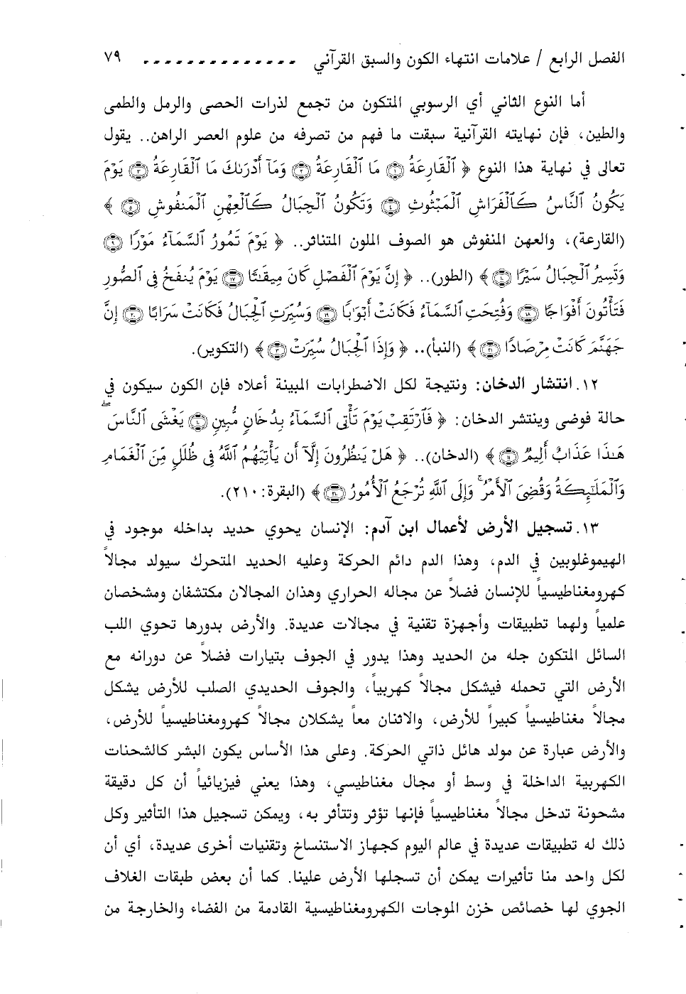 أما النوع الثاني أي الرسوبي المتكون من تجمع لذرات الحصى والرمل والطمى والطين، فإن نهايته القرآنية سبقت ما فهم من تصرفه من علوم العصر الراهن .. يقول تعالى في نهاية هذا النوع الْقارِعَةُ (1) مَا الْقارِعَةُ (2) وما أَدْراكَ مَا الْقارِعَةُ (3) يَوْمَ يَكُونُ النَّاسُ كَالْفَراشِ الْمَبْثُوثِ (4) وتَكُونُ الْجِبالُ كَالْعِهْنِ الْمَنْفُوشِ (5) (القارعة)، والعهن المنفوش هو الصوف الملون المتناثر .. يَوْمَ تَمُورُ السَّماءُ مَوْراً (9) وتَسِيرُ الْجِبالُ سَيْراً (10) (الطور) .. إِنَّ يَوْمَ الْفَصْلِ كانَ مِيقاتاً (17) يَوْمَ يُنْفَخُ فِي الصُّورِ فَتَاتُونَ أَفْواجاً (18) وفُتِحَتِ السَّماءُ فَكانَتْ أَبْواباً (19) وسُيِّرَتِ الْجِبالُ فَكانَتْ سَراباً (20) إِنَّ جَهَنَّمَ كانَتْ مِرْصاداً (21) (النبأ) .. وإِذَا الْجِبالُ سُيِّرَتْ (3) (التكوير).