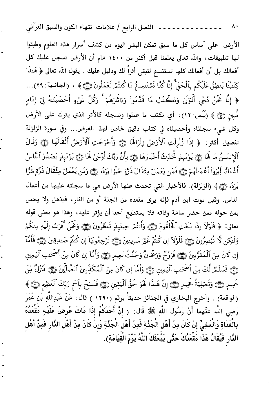 إِنَّا نَحْنُ نُحْيِ الْمَوْتى ونَكْتُبُ ما قَدَّمُوا وآثارَهُمْ وكُلَّ شَيْءٍ أَحْصَيْناهُ فِي إِمامٍ مُبِينٍ (12) (يس: 12)، أي نكتب ما عملوا ونسجله كالأثر الذي يترك على الأرض وكل شيء سجلناه وأحصيناه في كتاب دقيق خاص لهذا الغرض ... وفي سورة الزلزلة تفصيل أكثر: إِذا زُلْزِلَتِ الْأَرْضُ زِلْزالَها (1) وأَخْرَجَتِ الْأَرْضُ أَثْقالَها (2) وقالَ الْإِنْسانُ ما لَها (3) يَوْمَئِذٍ تُحَدِّثُ أَخْبارَها (4) بِأَنَّ رَبَّكَ أَوْحى لَها (5) يَوْمَئِذٍ يَصْدُرُ النَّاسُ أَشْتاتاً لِيُرَوْا أَعْمالَهُمْ (6) فَمَنْ يَعْمَلْ مِثْقالَ ذَرَّةٍ خَيْراً يَرَهُ (7) ومَنْ يَعْمَلْ مِثْقالَ ذَرَّةٍ شَرًّا يَرَهُ (8) (الزلزلة). فالأخبار التي تحدث عنها الأرض هي ما سجلته عليها من أعمال الناس. وقبل موت ابن آدم فإنه يرى مقعده من الجنة أو من النار، فيذهل ولا يحس بمن حوله ممن حضر ساعة وفاته فلا يستطيع أحد أن يؤثر عليه، وهذا هو معنى قوله تعالى: فَلَوْ لا إِذا بَلَغَتِ الْحُلْقُومَ (83) وأَنْتُمْ حِينَئِذٍ تَنْظُرُونَ (84) ونَحْنُ أَقْرَبُ إِلَيْهِ مِنْكُمْ ولكِنْ لا تُبْصِرُونَ (85) فَلَوْ لا إِنْ كُنْتُمْ غَيْرَ مَدِينِينَ (86) تَرْجِعُونَها إِنْ كُنْتُمْ صادِقِينَ (87) فَأَمَّا إِنْ كانَ مِنَ الْمُقَرَّبِينَ (88) فَرَوْحٌ ورَيْحانٌ وجَنَّةُ نَعِيمٍ (89) وأَمَّا إِنْ كانَ مِنْ أَصْحابِ الْيَمِينِ (90) فَسَلامٌ لَكَ مِنْ أَصْحابِ الْيَمِينِ (91) وأَمَّا إِنْ كانَ مِنَ الْمُكَذِّبِينَ الضَّالِّينَ (92) فَنُزُلٌ مِنْ حَمِيمٍ (93) وتَصْلِيَةُ جَحِيمٍ (94) إِنَّ هذا لَهُوَ حَقُّ الْيَقِينِ (95) فَسَبِّحْ بِاسْمِ رَبِّكَ الْعَظِيمِ (96) (الواقعة) .. وأخرج البخاري في الجنائز حديثا برقم (1290) قال: عن عبد اللّه بن عمر رضي اللّه عنهما أنّ رسول اللّه صلى اللّه عليه وسلم قال: (إنّ أحدكم إذا مات عرض عليه مقعده بالغداة والعشيّ إن كان من أهل الجنّة فمن أهل الجنّة وإن كان من أهل النّار فمن أهل النّار فيقال هذا مقعدك حتّى يبعثك اللّه يوم القيامة).