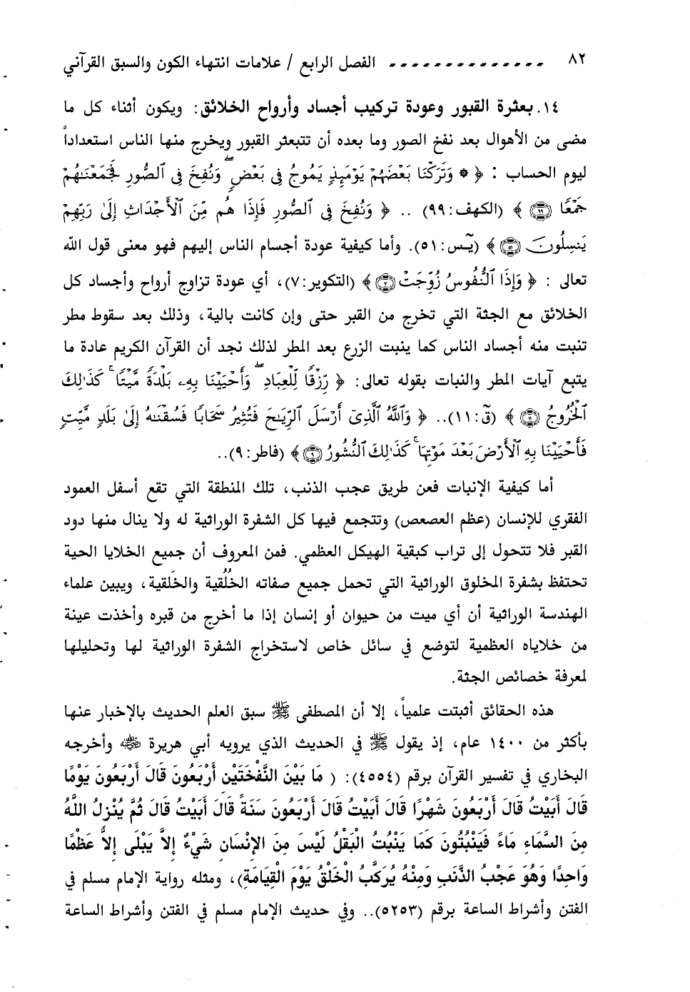هذه الحقائق أثبتت علميا، إلا أن المصطفى صلى اللّه عليه وسلم سبق العلم الحديث بالإخبار عنها بأكثر من 1400 عام، إذ يقول صلى اللّه عليه وسلم في الحديث الذي يرويه أبي هريرة رضي اللّه عنه وأخرجه البخاري في تفسير القرآن برقم (4554): (ما بين النّفختين أربعون قال أربعون يوما قال أبيت قال أربعون شهرا قال أبيت قال أربعون سنة قال أبيت قال ثمّ ينزل اللّه من السّماء ماء فينبتون كما ينبت البقل ليس من الإنسان شيء إلّا يبلى إلّا عظما واحدا وهو عجب الذّنب ومنه يركّب الخلق يوم القيامة)، ومثله رواية الإمام مسلم في الفتن وأشراط الساعة برقم (5253) .. وفي حديث الإمام مسلم في الفتن وأشراط الساعة