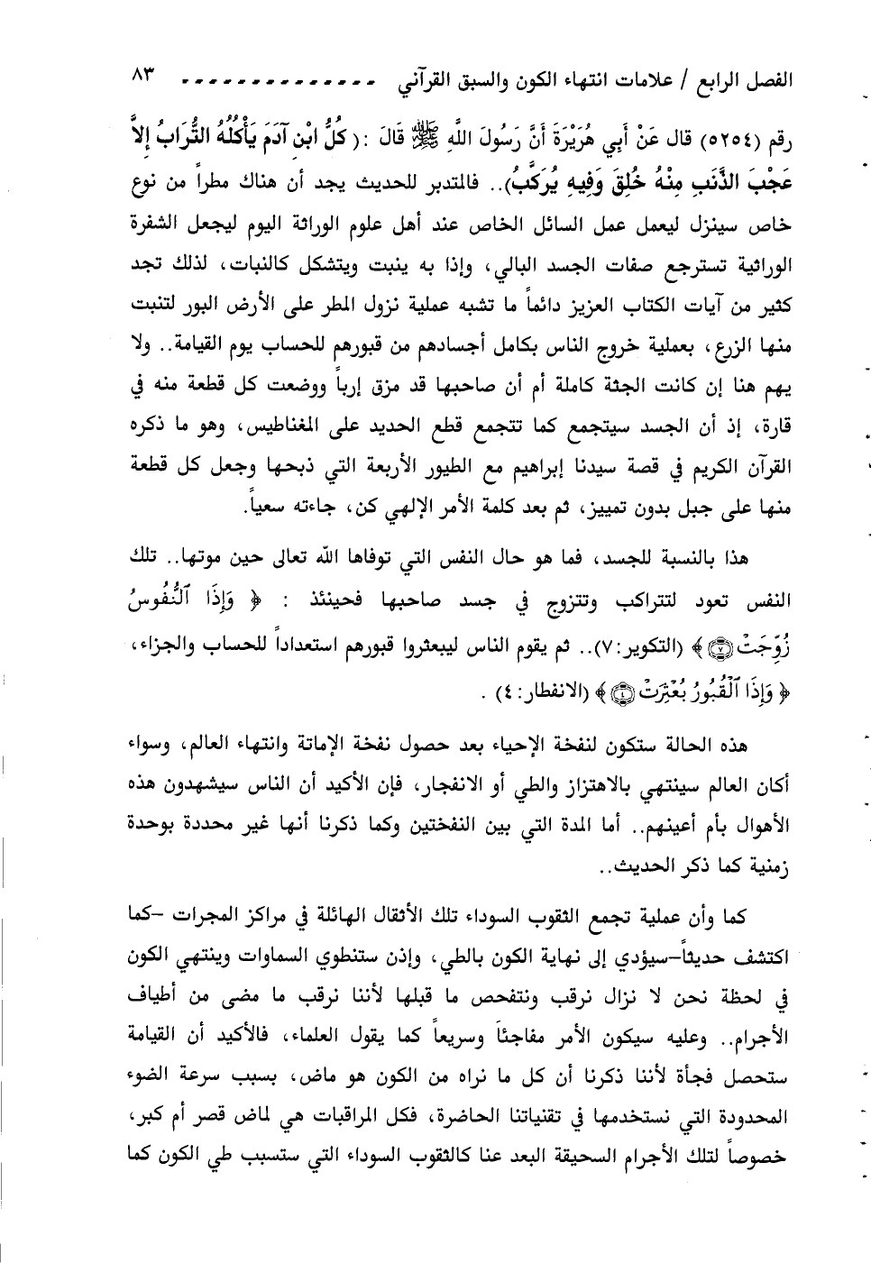 رقم (5254) قال عن أبي هريرة أنّ رسول اللّه صلى اللّه عليه وسلم قال: (كلّ ابن آدم يأكله التّراب إلّا عجب الذّنب منه خلق وفيه يركّب) .. فالمتدبر للحديث يجد أن هناك مطرا من نوع خاص سينزل ليعمل عمل السائل الخاص عند أهل علوم الوراثة اليوم ليجعل الشفرة الوراثية تسترجع صفات الجسد البالي، وإذا به ينبت ويتشكل كالنبات، لذلك تجد كثير من آيات الكتاب العزيز دائما ما تشبه عملية نزول المطر على الأرض البور لتنبت منها الزرع، بعملية خروج الناس بكامل أجسادهم من قبورهم للحساب يوم القيامة .. ولا يهم هنا إن كانت الجثة كاملة أم أن صاحبها قد مزق إربا ووضعت كل قطعة منه في قارة، إذ أن الجسد سيتجمع كما تتجمع قطع الحديد على المغناطيس، وهو ما ذكره القرآن الكريم في قصة سيدنا إبراهيم مع الطيور الأربعة التي ذبحها وجعل كل قطعة منها على جبل بدون تمييز، ثم بعد كلمة الأمر الإلهي كن، جاءته سعيا.