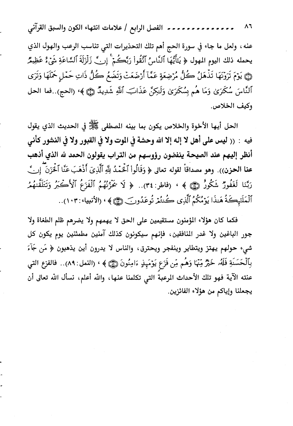 عنه، ولعل ما جاء في سورة الحج أهم تلك التحذيرات التي تناسب الرعب والهول الذي يحمله ذلك اليوم المهول يا أَيُّهَا النَّاسُ اتَّقُوا رَبَّكُمْ إِنَّ زَلْزَلَةَ السَّاعَةِ شَيْءٌ عَظِيمٌ (1) يَوْمَ تَرَوْنَها تَذْهَلُ كُلُّ مُرْضِعَةٍ عَمَّا أَرْضَعَتْ وتَضَعُ كُلُّ ذاتِ حَمْلٍ حَمْلَها وتَرَى النَّاسَ سُكارى وما هُمْ بِسُكارى ولكِنَّ عَذابَ اللَّهِ شَدِيدٌ (2)، (الحج) .. فما الحل وكيف الخلاص.