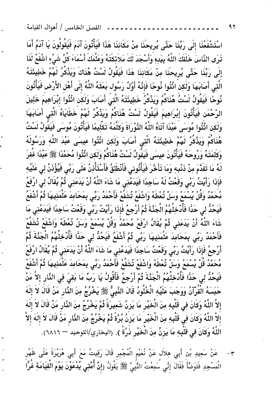 استشفعنا إلى ربّنا حتّى يريحنا من مكاننا هذا فيأتون آدم فيقولون يا آدم أما ترى النّاس خلقك اللّه بيده وأسجد لك ملائكته وعلّمك أسماء كلّ شيء اشفع لنا إلى ربّنا حتّى يريحنا من مكاننا هذا فيقول لست هناك ويذكر لهم خطيئته الّتي أصابها ولكن ائتوا نوحا فإنّه أوّل رسول بعثه اللّه إلى أهل الأرض فيأتون نوحا فيقول لست هناكم ويذكر خطيئته الّتي أصاب ولكن ائتوا إبراهيم خليل الرّحمن فيأتون إبراهيم فيقول لست هناكم ويذكر لهم خطاياه الّتي أصابها ولكن ائتوا موسى عبدا آتاه اللّه التّوراة وكلّمه تكليما فيأتون موسى فيقول لست هناكم ويذكر لهم خطيئته الّتي أصاب ولكن ائتوا عيسى عبد اللّه ورسوله وكلمته وروحه فيأتون عيسى فيقول لست هناكم ولكن ائتوا محمّدا صلى اللّه عليه وسلم عبدا غفر له ما تقدّم من ذنبه وما تأخّر فيأتوني فأنطلق فأستأذن على ربّي فيؤذن لي عليه فإذا رأيت ربّي وقعت له ساجدا فيدعني ما شاء اللّه أن يدعني ثمّ يقال لي ارفع محمّد وقل يسمع وسل تعطه واشفع تشفّع فأحمد ربّي بمحامد علّمنيها ثمّ أشفع فيحدّ لي حدّا فأدخلهم الجنّة ثمّ أرجع فإذا رأيت ربّي وقعت ساجدا فيدعني ما شاء اللّه أن يدعني ثمّ يقال ارفع محمّد وقل يسمع وسل تعطه واشفع تشفّع فأحمد ربّي بمحامد علّمنيها ربّي ثمّ أشفع فيحدّ لي حدّا فأدخلهم الجنّة ثمّ أرجع فإذا رأيت ربّي وقعت ساجدا فيدعني ما شاء اللّه أن يدعني ثمّ يقال ارفع محمّد قل يسمع وسل تعطه واشفع تشفّع فأحمد ربّي بمحامد علّمنيها ثمّ أشفع فيحدّ لي حدّا فأدخلهم الجنّة ثمّ أرجع فأقول يا ربّ ما بقي في النّار إلّا من حبسه القرآن ووجب عليه الخلود قال النّبيّ صلى اللّه عليه وسلم يخرج من النّار من قال لا إله إلّا اللّه وكان في قلبه من الخير ما يزن شعيرة ثمّ يخرج من النّار من قال لا إله إلّا اللّه وكان في قلبه من الخير ما يزن برّة ثمّ يخرج من النّار من قال لا إله إلّا اللّه وكان في قلبه ما يزن من الخير ذرّة). (البخاري/ التوحيد - 6816).