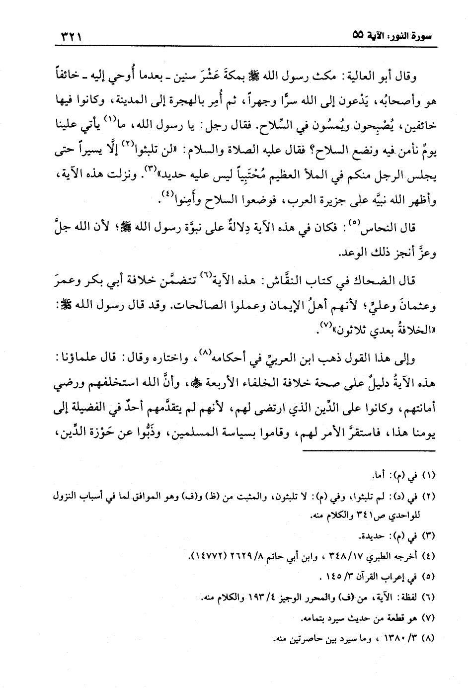قَوْلُهُ تَعَالَى:" وَإِذْ يَتَحاجُّونَ فِي النَّارِ" أَيْ يَخْتَصِمُونَ فِيهَا" فَيَقُولُ الضُّعَفاءُ لِلَّذِينَ اسْتَكْبَرُوا" عَنِ الِانْقِيَادِ لِلْأَنْبِيَاءِ" إِنَّا كُنَّا لَكُمْ تَبَعاً" فِيمَا دَعَوْتُمُونَا إِلَيْهِ مِنَ الشِّرْكِ فِي الدُّنْيَا" فَهَلْ أَنْتُمْ مُغْنُونَ" أَيْ مُتَحَمِّلُونَ" عَنَّا نَصِيباً مِنَ النَّارِ" أي جزاء مِنَ الْعَذَابِ. وَالتَّبَعُ يَكُونُ وَاحِدًا وَيَكُونُ جَمْعًا فِي قَوْلِ الْبَصْرِيِّينَ وَاحِدُهُ تَابِعٌ. وَقَالَ أَهْلُ الْكُوفَةِ: هُوَ جَمْعٌ لَا وَاحِدَ لَهُ كَالْمَصْدَرِ فَلِذَلِكَ لَمْ يُجْمَعْ وَلَوْ جُمِعَ لَقِيلَ أَتْبَاعٌ." قالَ الَّذِينَ اسْتَكْبَرُوا إِنَّا كُلٌّ فِيها" أَيْ فِي جَهَنَّمَ. قَالَ الْأَخْفَشُ:" كُلٌّ" مَرْفُوعٌ بِالِابْتِدَاءِ. الْكِسَائِيُّ وَالْفَرَّاءُ" إِنَّا كُلًّا فِيهَا" بِالنَّصْبِ عَلَى النَّعْتِ وَالتَّأْكِيدِ لِلْمُضْمَرِ فِي" إِنَّا" وَكَذَلِكَ قَرَأَ ابْنُ السَّمَيْقَعِ وَعِيسَى بْنُ عُمَرَ وَالْكُوفِيُّونَ يُسَمُّونَ التَّأْكِيدَ نَعْتًا. وَمَنَعَ ذَلِكَ سِيبَوَيْهِ، قَالَ: لِأَنَّ" كُلًّا" لَا تُنْعَتُ وَلَا يُنْعَتُ بِهَا. وَلَا يَجُوزُ الْبَدَلُ فِيهِ لِأَنَّ الْمُخْبِرَ عَنْ نَفْسِهِ لَا يُبْدَلُ مِنْهُ غَيْرُهُ، وَقَالَ مَعْنَاهُ الْمُبَرِّدُ قَالَ: لَا يَجُوزُ أَنْ يُبْدَلَ مِنَ الْمُضْمَرِ هُنَا، لِأَنَّهُ مُخَاطَبٌ وَلَا يُبْدَلُ مِنَ الْمُخَاطَبِ وَلَا مِنَ الْمُخَاطِبِ، لِأَنَّهُمَا لَا يُشْكِلَانِ فَيُبْدَلُ مِنْهُمَا، هَذَا نَصُّ كَلَامِهِ." إِنَّ اللَّهَ قَدْ حَكَمَ بَيْنَ الْعِبادِ" أَيْ لَا يُؤَاخِذُ أَحَدًا بِذَنْبِ غَيْرِهِ، فَكُلٌّ مِنَّا كَافِرٌ. قَوْلُهُ تَعَالَى:" وَقالَ الَّذِينَ فِي النَّارِ" مِنَ الْأُمَمِ الْكَافِرَةِ. وَمِنَ الْعَرَبِ مَنْ يَقُولُ اللَّذُونَ عَلَى أَنَّهُ جَمْعٌ مُسَلَّمٌ مُعْرَبٌ، وَمَنْ قَالَ:" الَّذِينَ" فِي الرَّفْعِ بَنَاهُ كَمَا كَانَ فِي الْوَاحِدِ مَبْنِيًّا. وَقَالَ الْأَخْفَشُ: ضُمَّتِ النُّونُ إِلَى الَّذِي فَأَشْبَهَ خَمْسَةَ عَشَرَ فَبُنِيَ عَلَى الْفَتْحِ." لِخَزَنَةِ جَهَنَّمَ" خَزَنَةُ جَمْعُ خَازِنٍ وَيُقَالُ: خُزَّانٌ وَخُزَّنٌ." ادْعُوا رَبَّكُمْ يُخَفِّفْ عَنَّا يَوْماً مِنَ الْعَذابِ"" يُخَفِّفْ" جَوَابٌ مَجْزُومٌ وَإِنْ كَانَ بِالْفَاءِ كَانَ مَنْصُوبًا، إِلَّا أَنَّ الْأَكْثَرَ فِي كَلَامِ الْعَرَبِ فِي جَوَابِ الْأَمْرِ وَمَا أَشْبَهَهُ أَنْ يَكُونَ بِغَيْرِ فَاءٍ وَعَلَى هَذَا جَاءَ الْقُرْآنُ بِأَفْصَحِ اللُّغَاتِ كما قال «1»:
